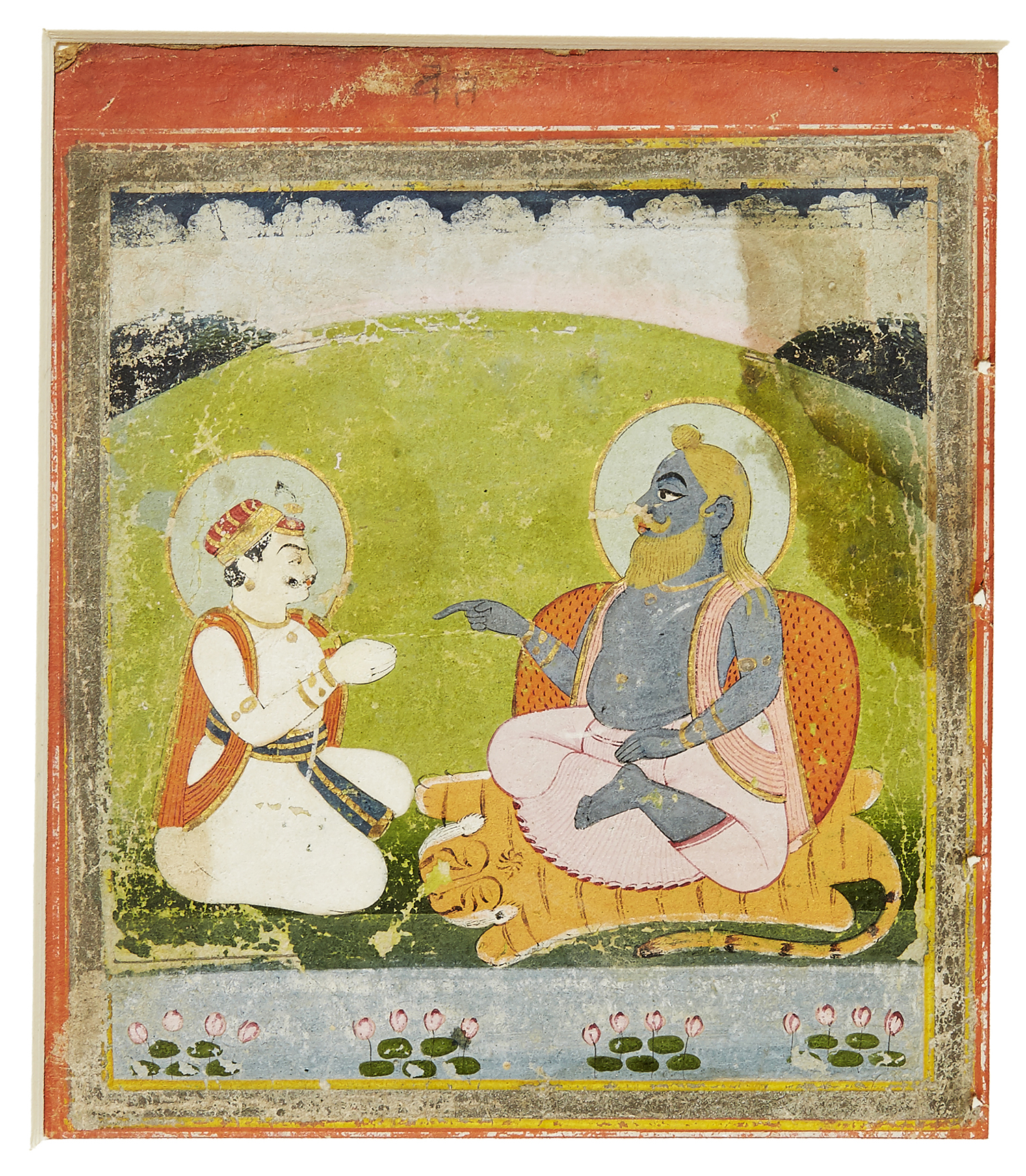 One depicting Vishnu with Garuda carrying his throne, the other depicting a ruler receiving darshan from a Vaishnav saint seated on a tiger skin.