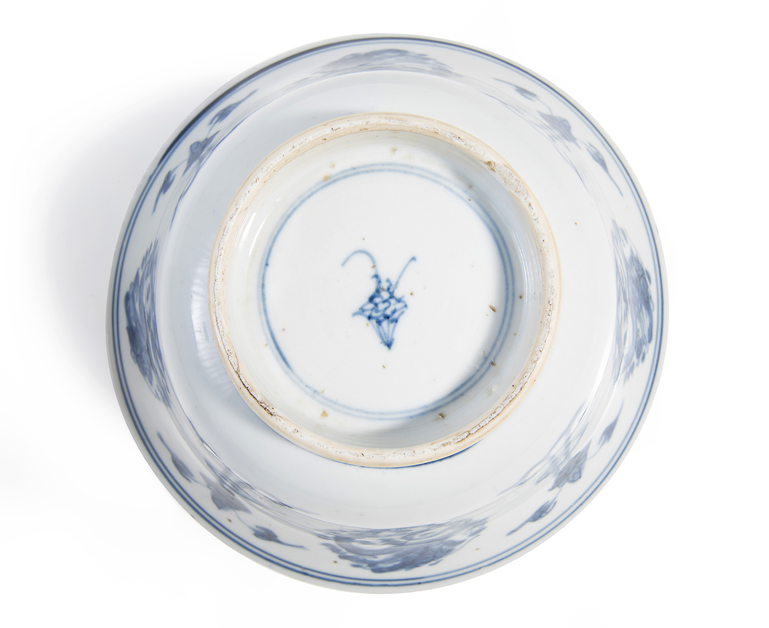 A crack to the footrim, multiple frits to the mouth-rim from the firing. Old wear to the glaze in the interior from normal use.