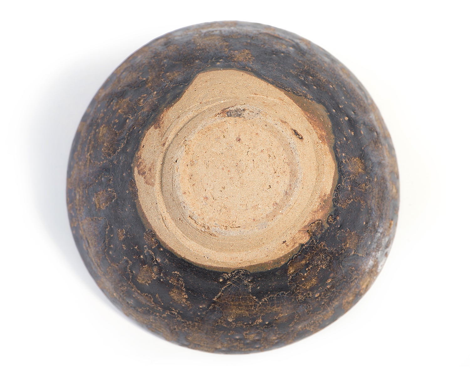 The teabowl of rounded conical form, the interior and exterior with a deep brown and amber glaze in a tortoiseshell effect, the unglazed base showing a sandy buff coloured clay.