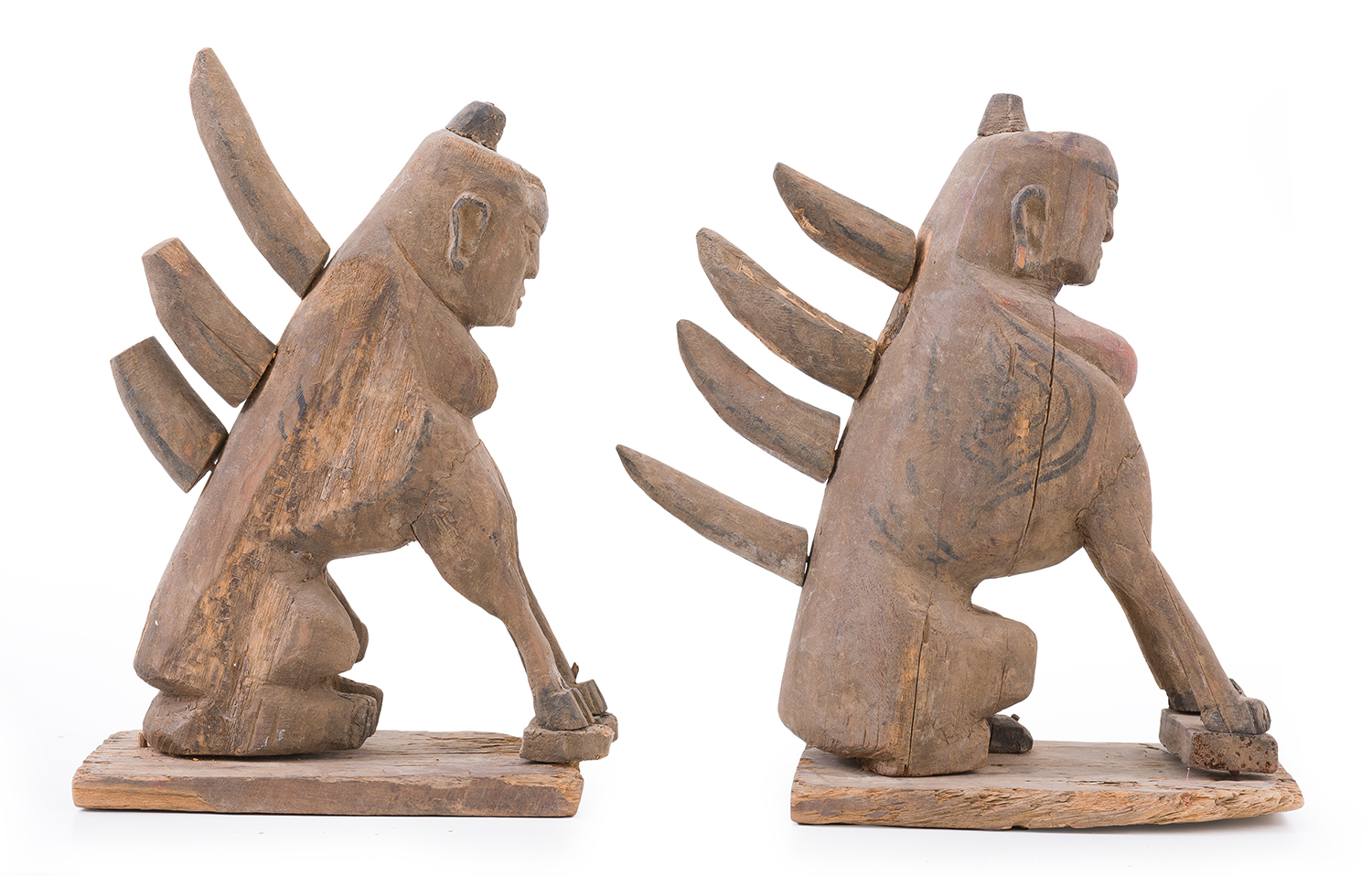 The figures naively carved, with horns atop their heads and along their spines. Sitting on original plinth bases with remanent painted details.