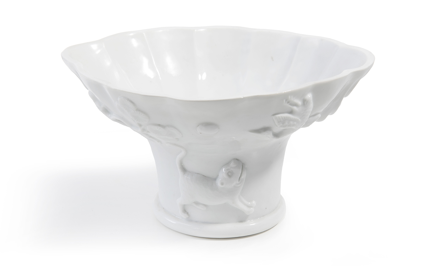 Of rhinocerous horn libation cup form, with moulded and applique decoration to the exterior depicting a tiger, crane and pine bough to one side, the other side depicting a dragon, qilong, plum blossom and a flaming pearl.