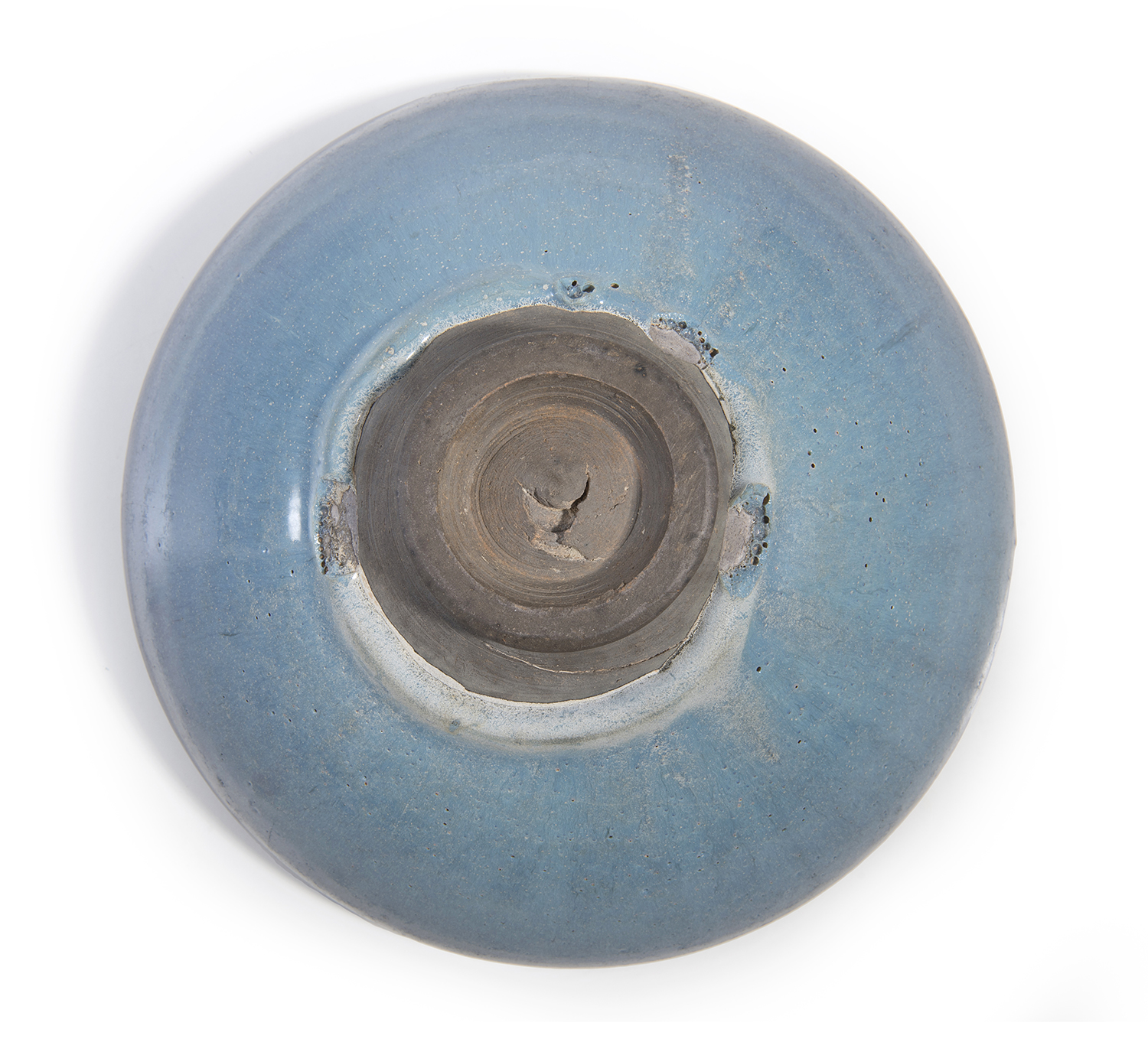 A small chip to the mouth-rim, four chips to the glaze where the thick glaze pools around the footrim, and a crack to the exposed body above the foot, possibly from the firing. Natural wear to the glaze in the interior from use.