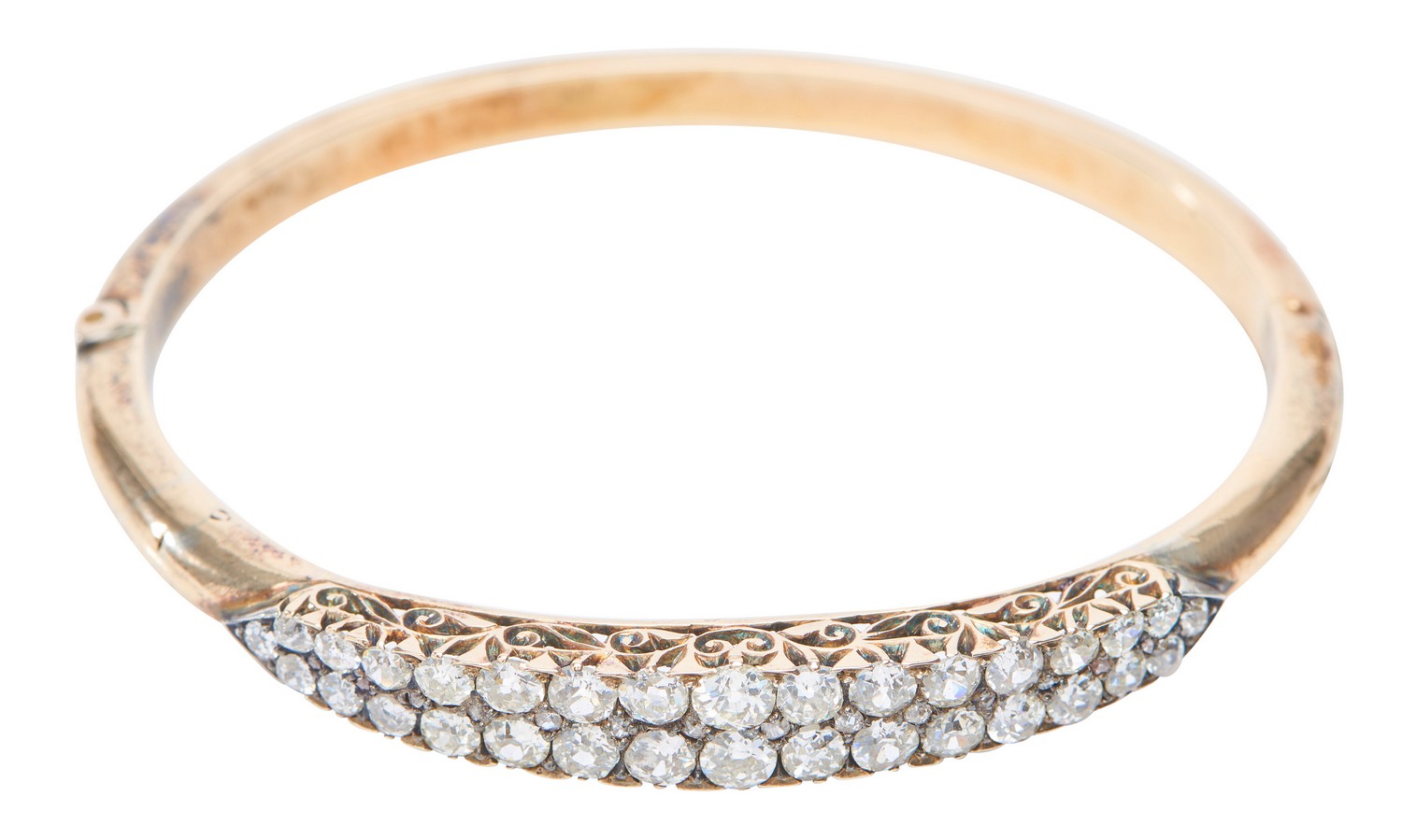 The hinged bangle comprising a double row of graduating old European cut diamonds and fine diamond detail totalling an estimated 3.70cts, in 15ct gold.