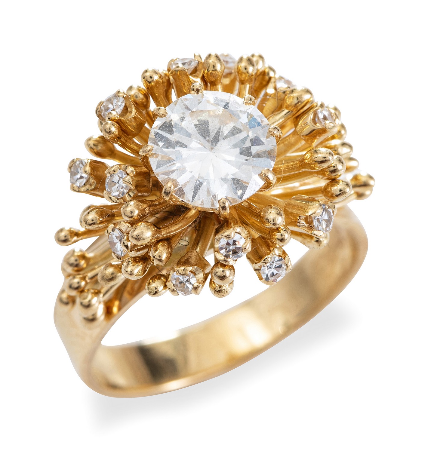 Featuring a round brilliant cut diamond weighing 1.45cts, centred within a spoked surround, randomly set with fine diamond detail, in 18ct gold, ring size P 1/2.