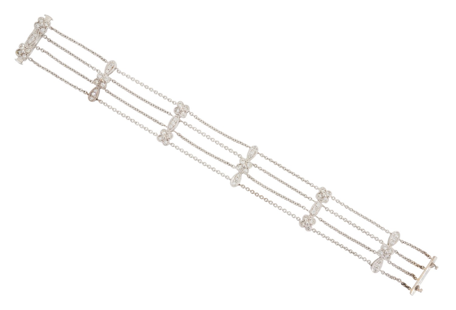 Comprising six floral style links set with round brilliant cut diamonds, spaced on a quadruple row of fine trace chain, in 18ct white gold, total length 165mm.