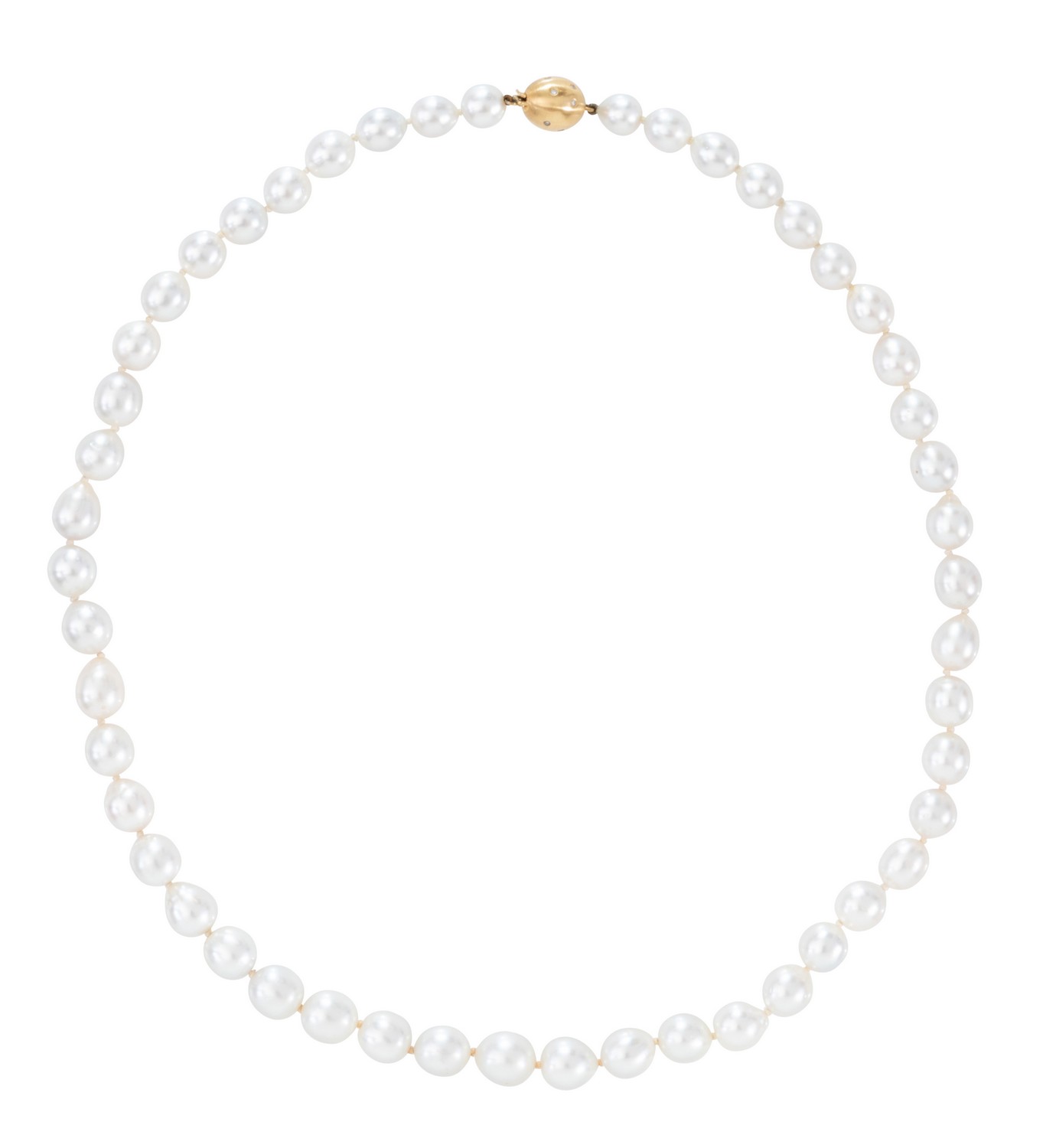 Comprising graduated semi baroque pearls of silver white hues measuring 9.3mm to 11.7mm, to an 18ct gold oval clasp set with round brilliant cut diamonds, total length 640mm.