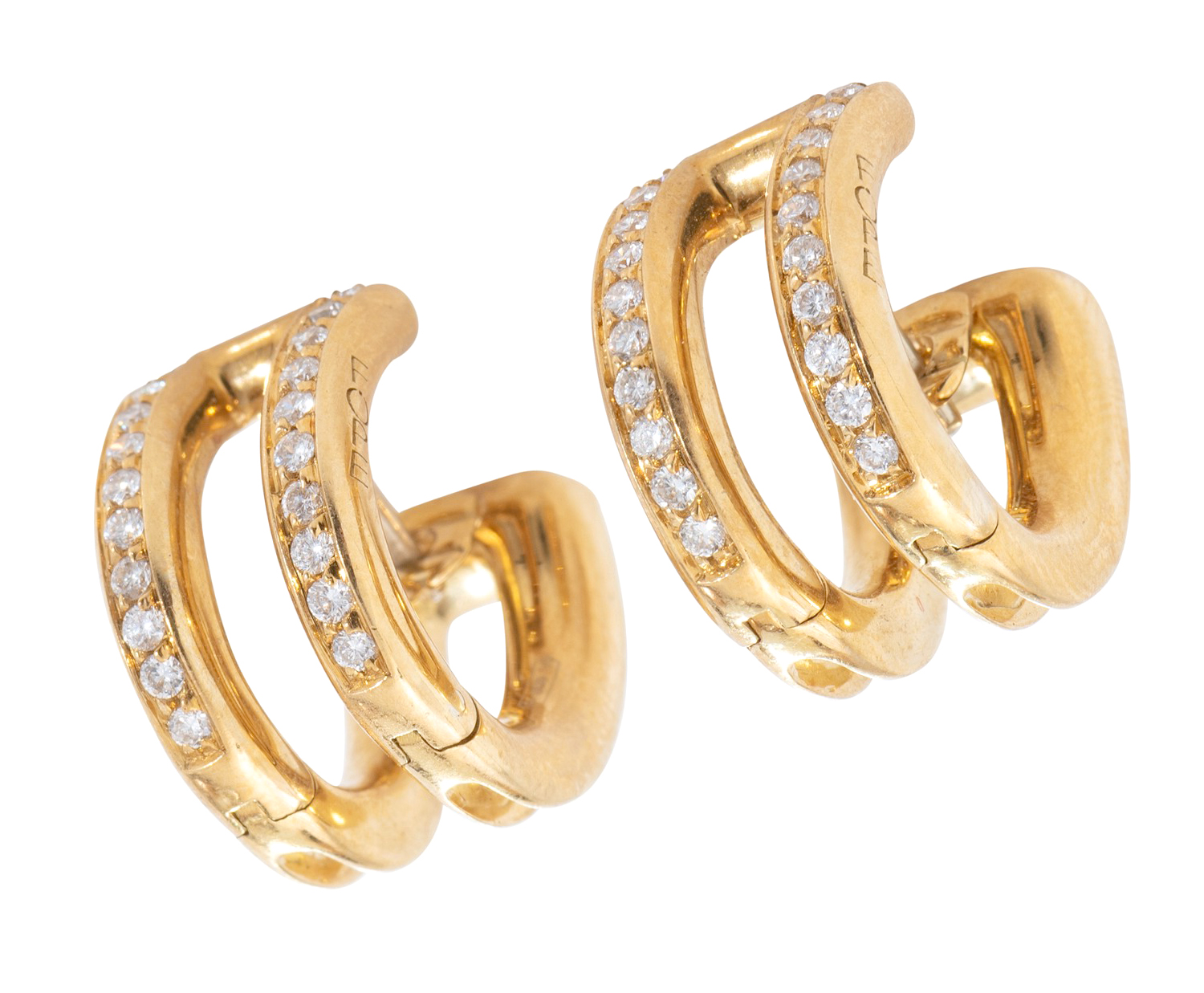 The pierced huggie design set with small round brilliant cut diamonds, to post fittings, in 18ct gold.