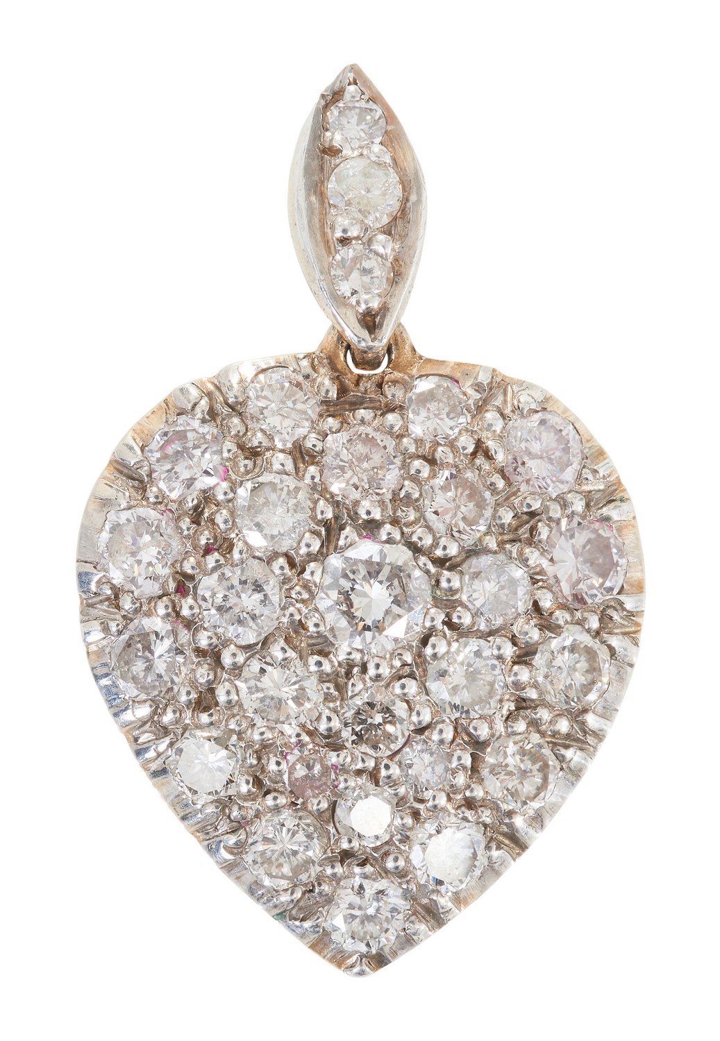 The heart shaped pendant, pavé set with diamonds totalling 1.45cts, to a conforming diamond set bale, in 14ct gold.