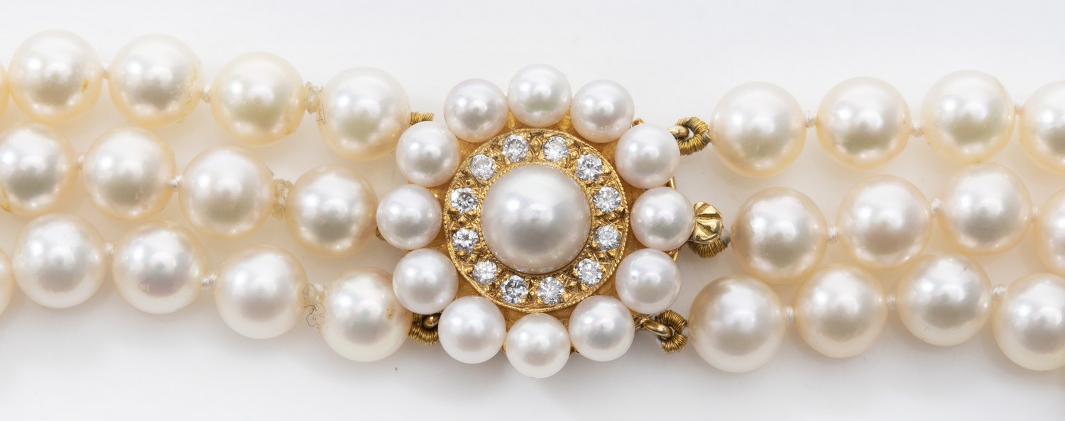 Comprising a triple row of round pearls of cream and pink hues measuring 6.01mm to 6.35mm, to a circular pearl and diamond set cluster clasp, in 18ct gold, total length 375mm.