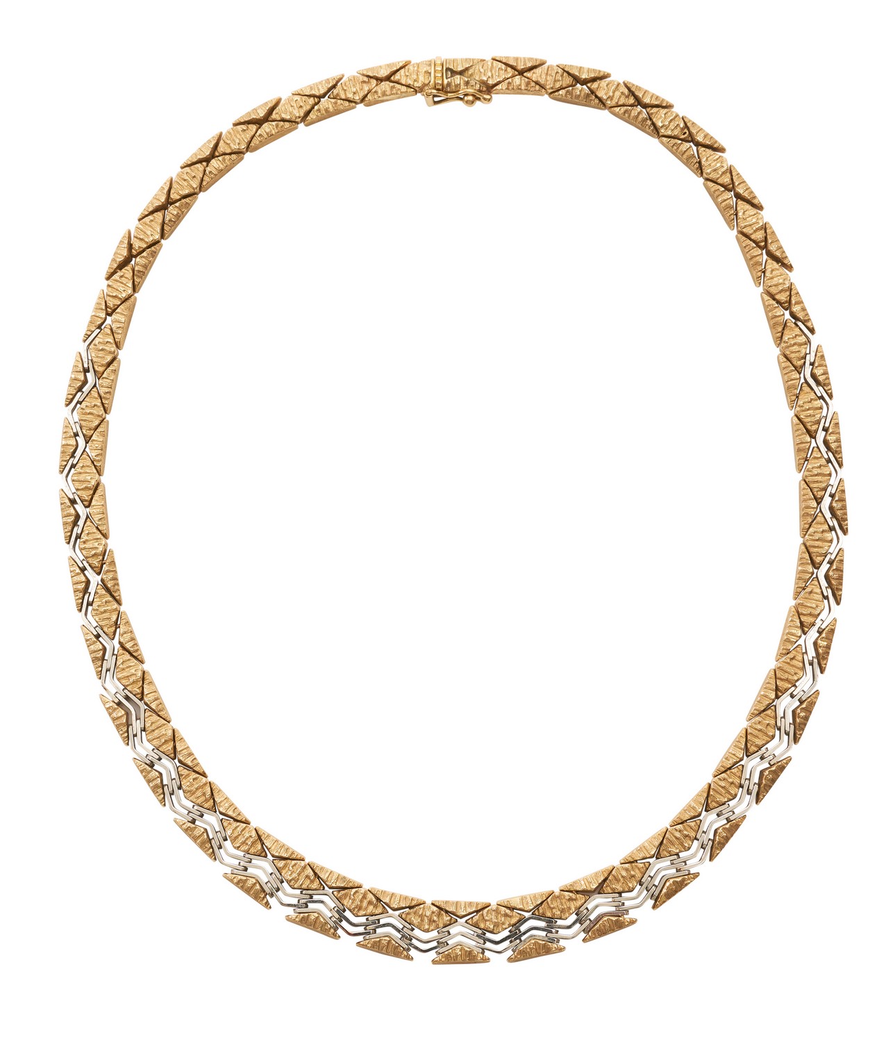 Comprising tapering articulated and textured links with fine linear detail in two tone 18ct gold, total length 390mm.