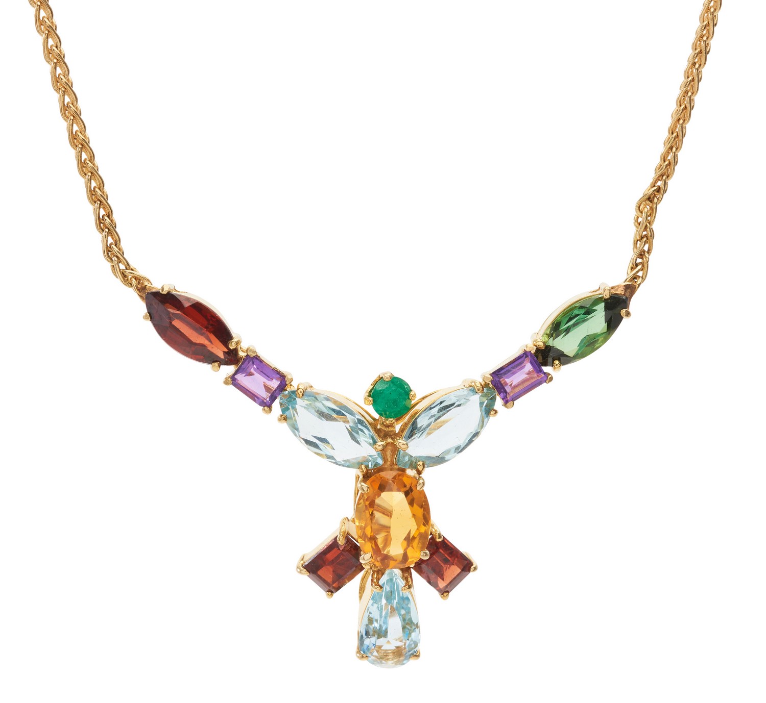 A MULTI GEM SET NECKLACE-Featuring citrine, garnets, topaz, emerald and amethysts, suspended on a fox link chain, in 18ct gold, total length 550mm.