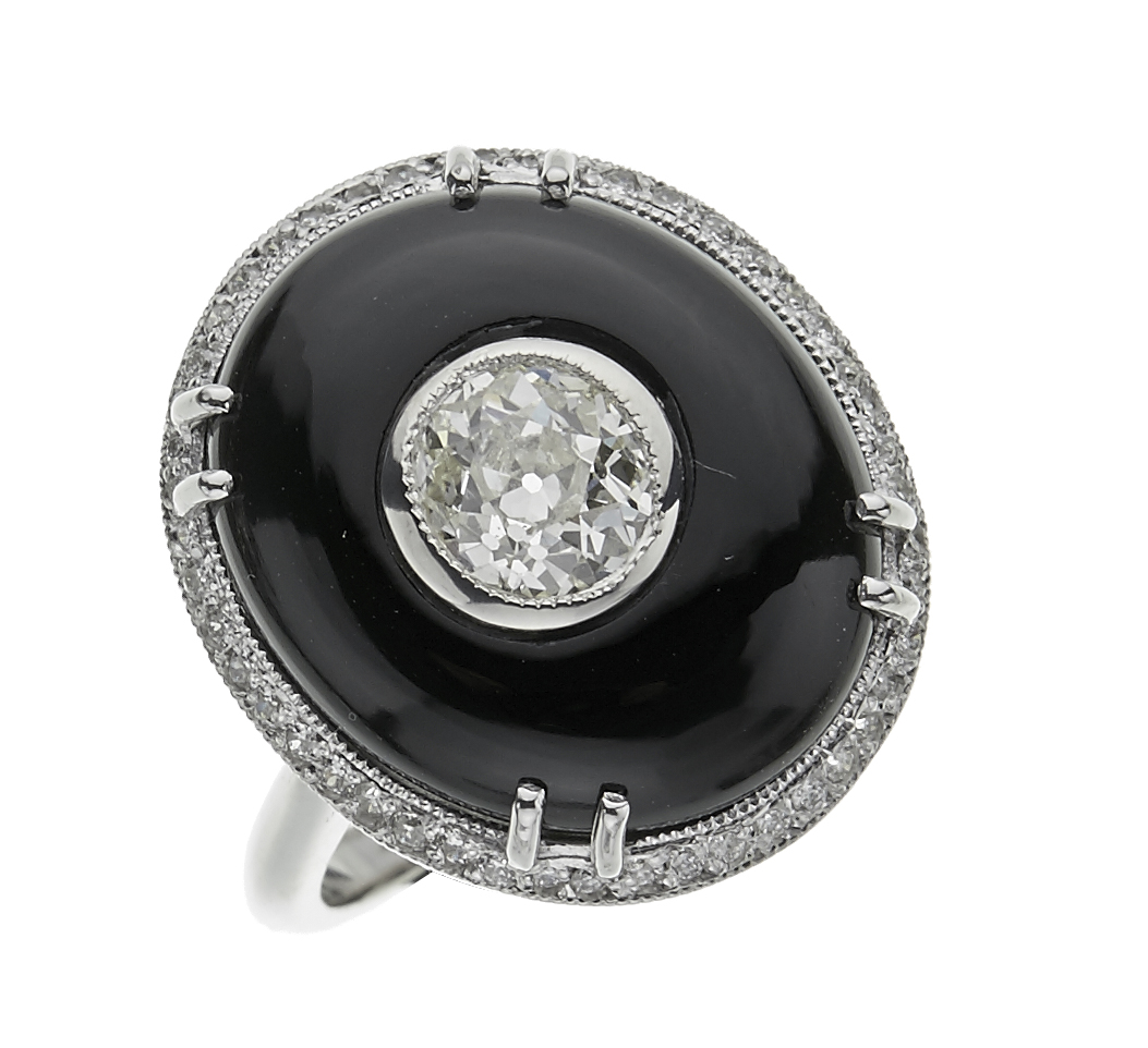 Of Art Deco style, centrally set with on old European cut diamond weighing 0.98cts, to a domed oval onyx plaque surrounded by further diamonds totalling 0.30cts, in 18ct white gold, ring size O.