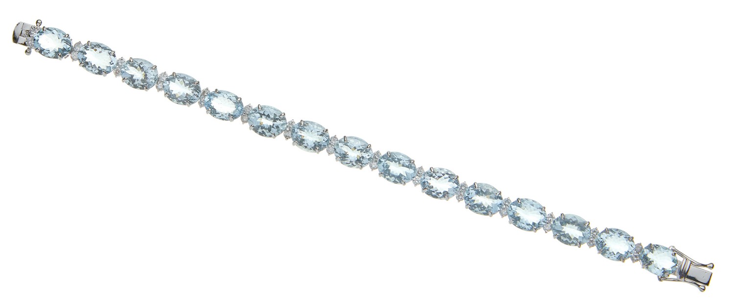 Comprising fifteen oval cut aquamarines totalling 35.80cts, alternating with round brilliant cut diamonds totalling 1.90cts, in 18ct white gold.