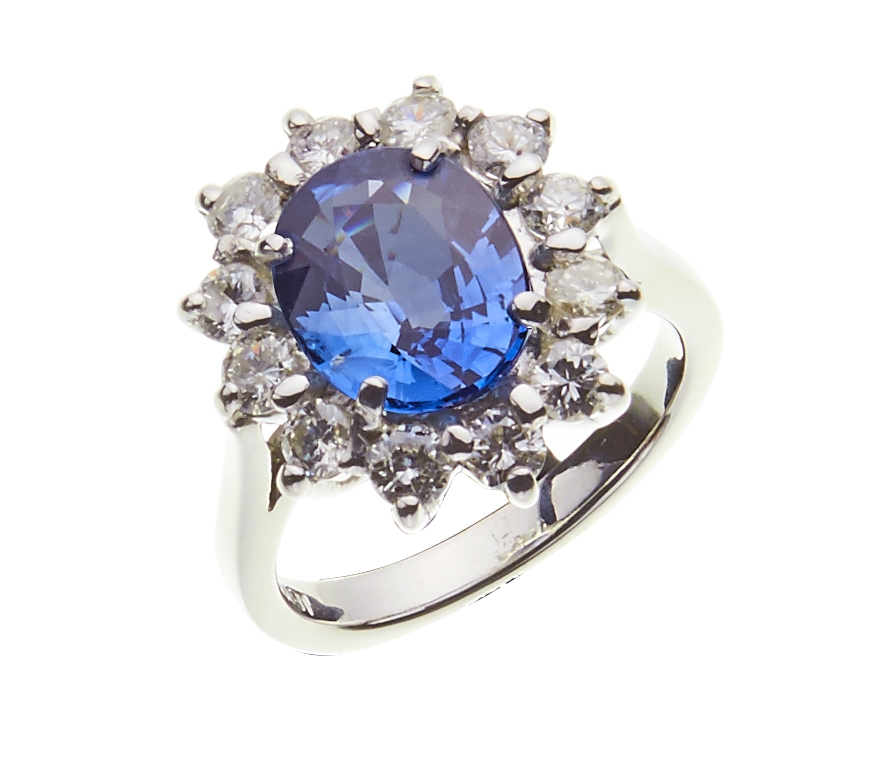 Centrally set with an oval cut blue sapphire weighing 3.0cts, surrounded by round brilliant cut diamonds totalling 1.28cts, in 18ct white gold, ring size M.