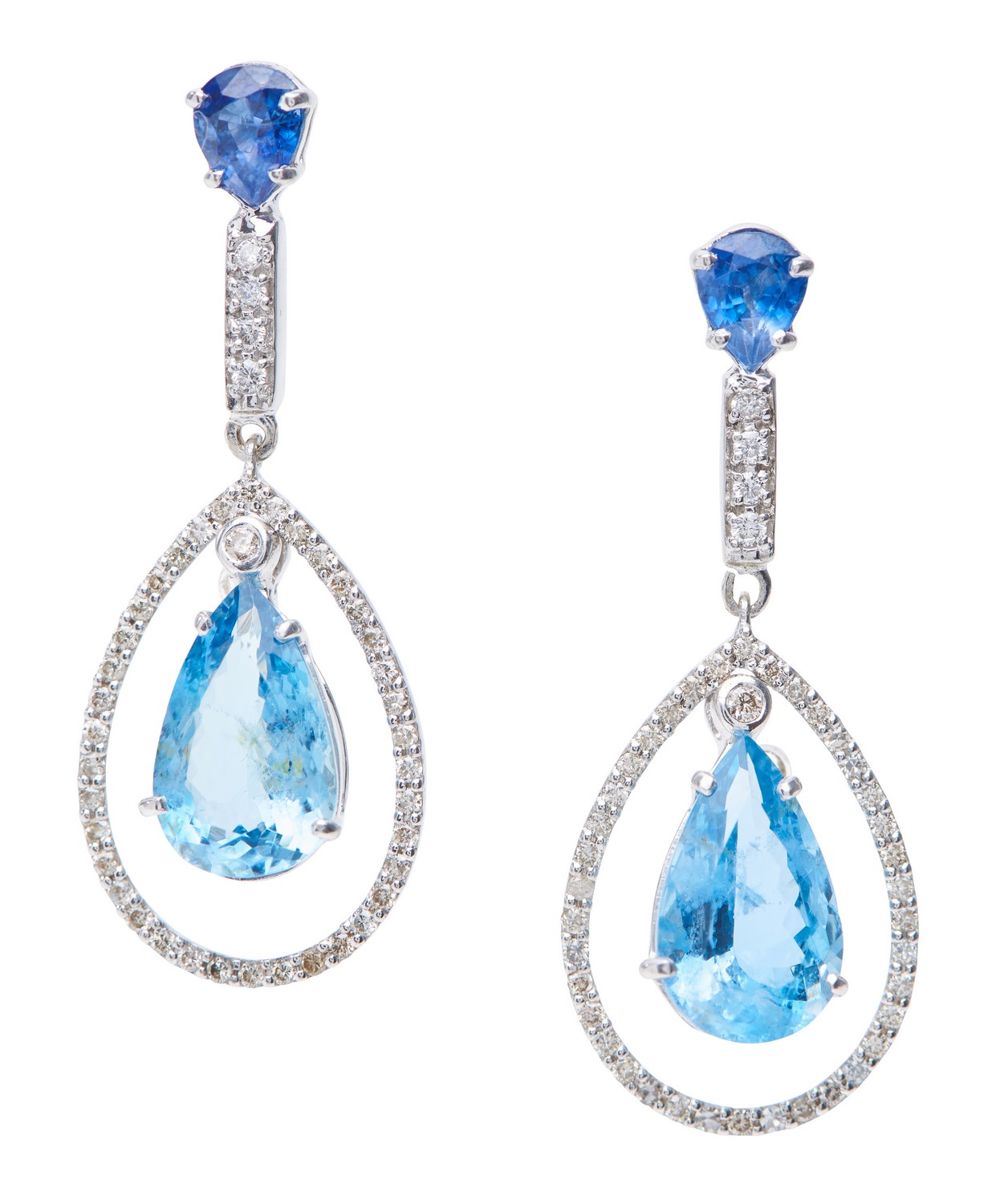 A PAIR OF AQUAMARINE, SAPPHIRE AND DIAMOND DROP EARRINGS - Each earring featuring a pear cut aquamarine centred within a conforming shaped diamond surround and surmount, suspended on a pear cut sapphire stud fitting, in 18ct white gold.