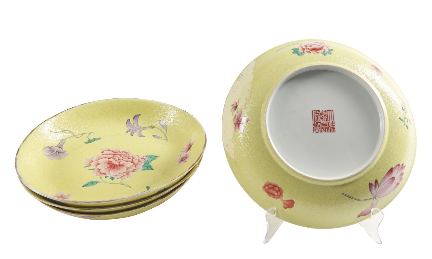 FOUR CHINESE YELLOW-GROUND SGRAFFITO FAMILLE ROSE DISHES