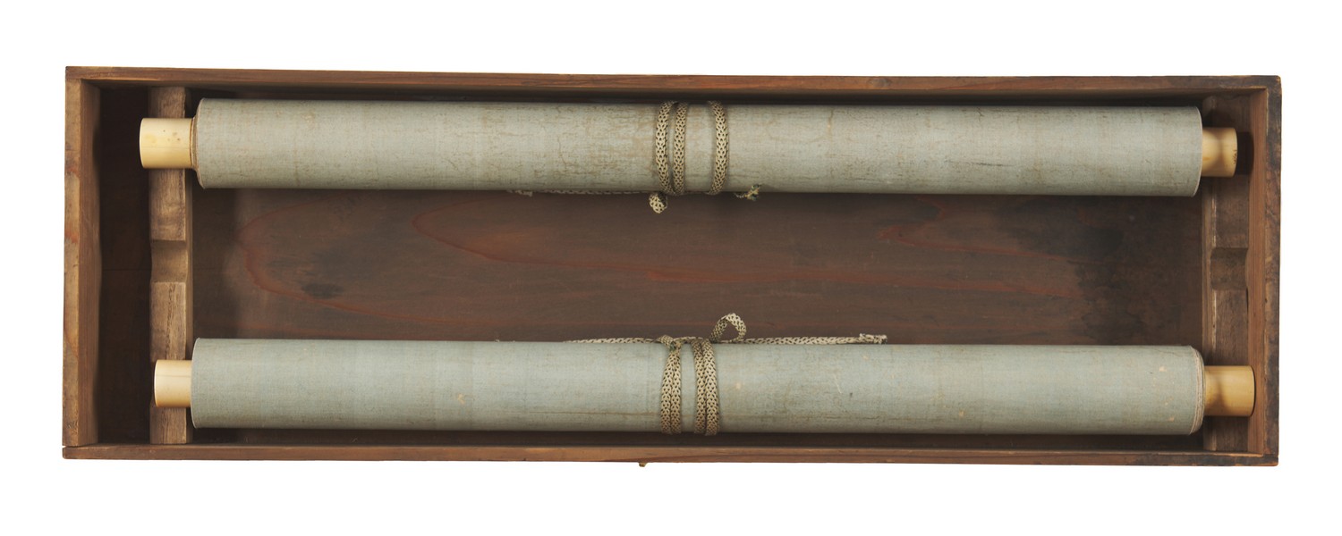 Decorated with Manchurian cranes with bamboo and pine trees, mounted as scrolls, together with an inscribed tomobako (original wooden box) for three scrolls (one missing).