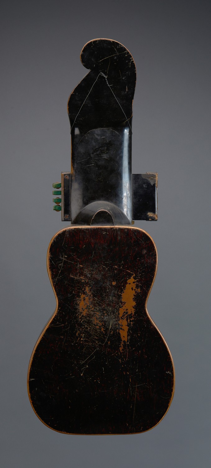 significant losses and scratches overall, muting felts worn consistent with age and use. missing one button and strings missing. one crack to side. strap button missing.