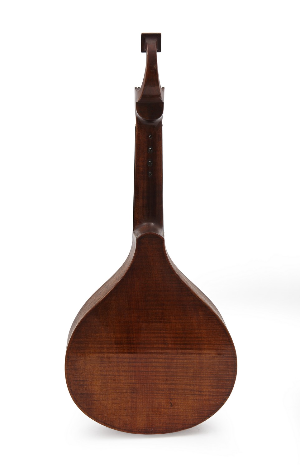 The headstock terminating with a flattened finial covered in tortoiseshell and mother-of-pearl, the fingerboard veneered in tortoiseshell and mother-of-pearl, the sound hole rose is an intricately pierced brass disk depicting a cittern player, inscribed to the back of the head with 'Preston Maker London' below.