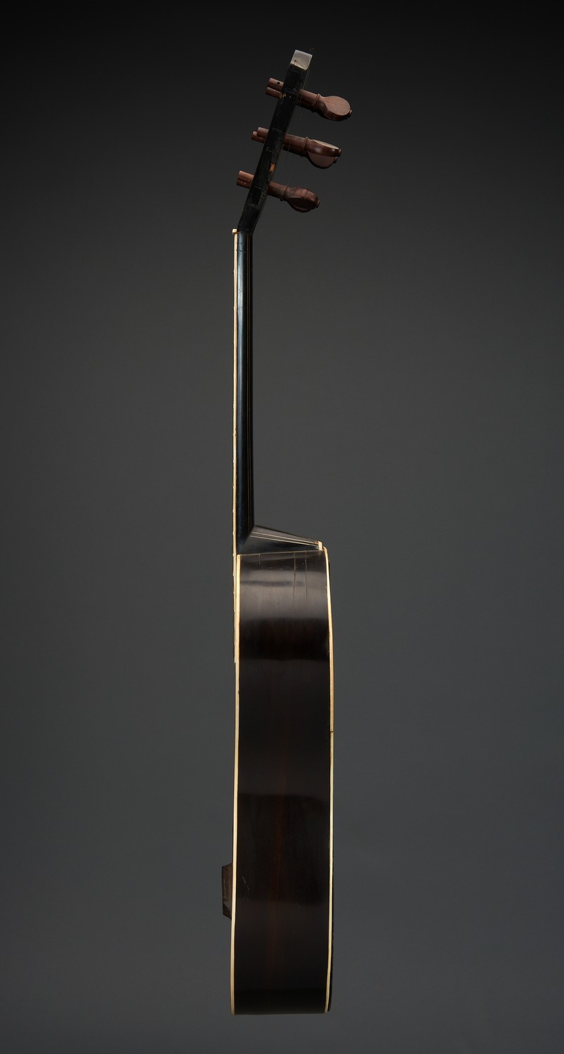 Bone inlay to the headstock, fingerboard, sound hole and edges. The bridge terminating in delicately cut scrolling vines, in a coffin case. Ivory trimming to soundbox. Contains Brazilian rosewood.
