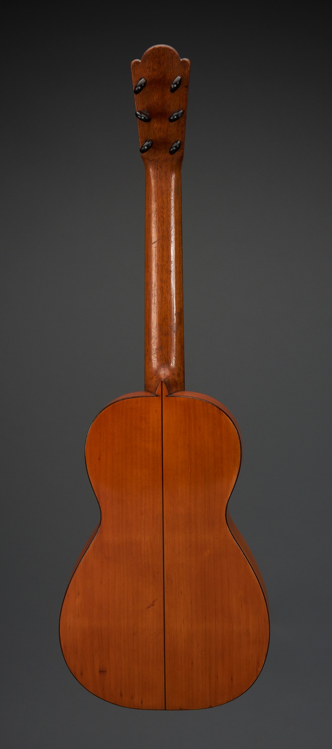 Fine string inlay to edges and parquetry inlay around sound hole. The neck and head crafted from a single piece of pine. Paper label to interior. Original hardwood case (leather handle broken). Contains Brazilian rosewood,