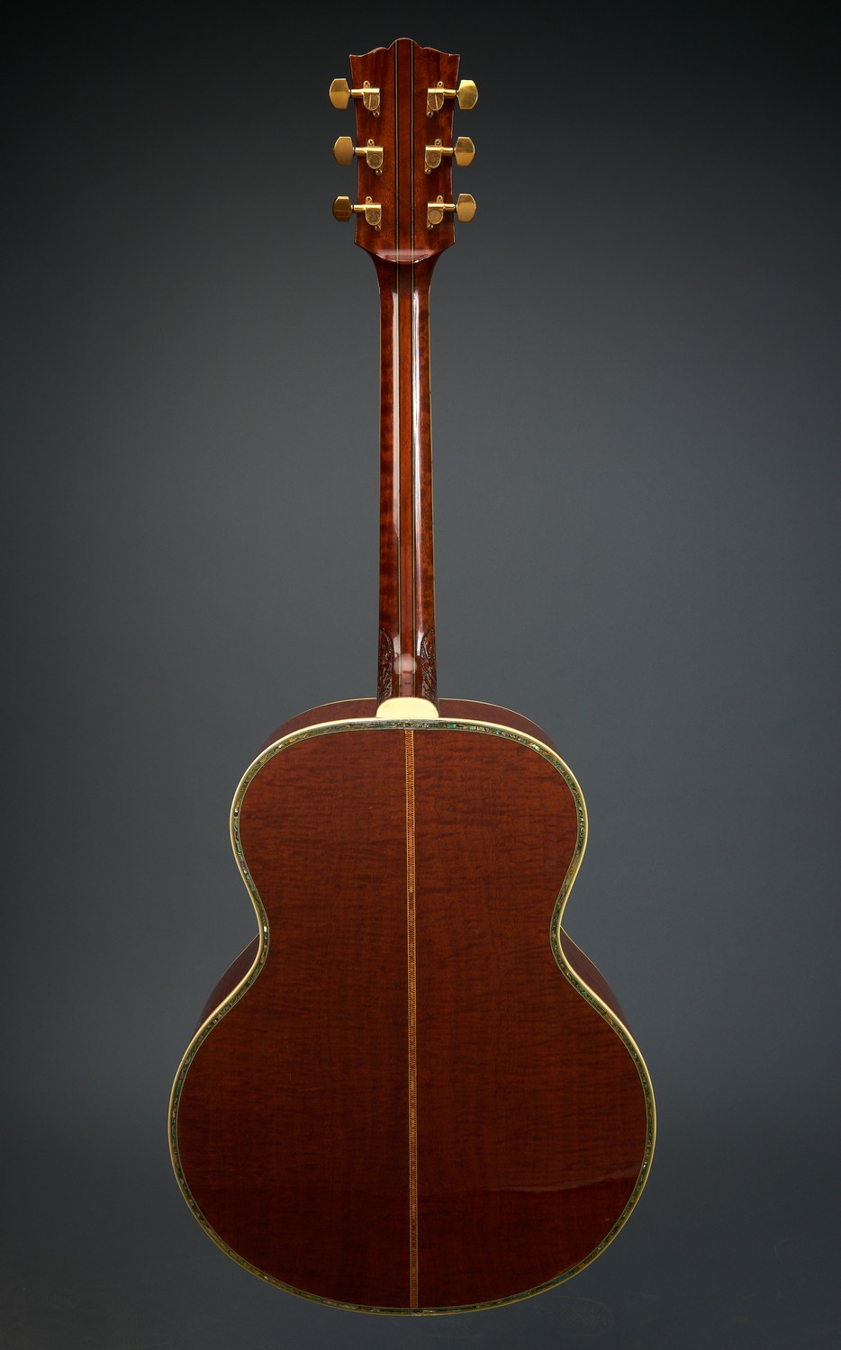 Inlay with mother-of-pearl and abalone shell to all edges of table, back, sound hole and fingerboard. 'Knight" inlay into headstock in mother-of-pearl.