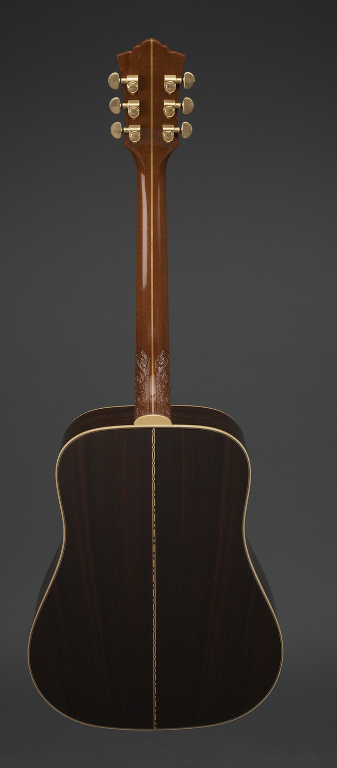 Abalone shell inlay to front edges, fingerboard, around sound hole and Guild logo to headstock, serial number verso to headstock, Grover tuning keys, and factory mark to interior. housed in orginial hardcase. East Indian Rosewood back and sides.
