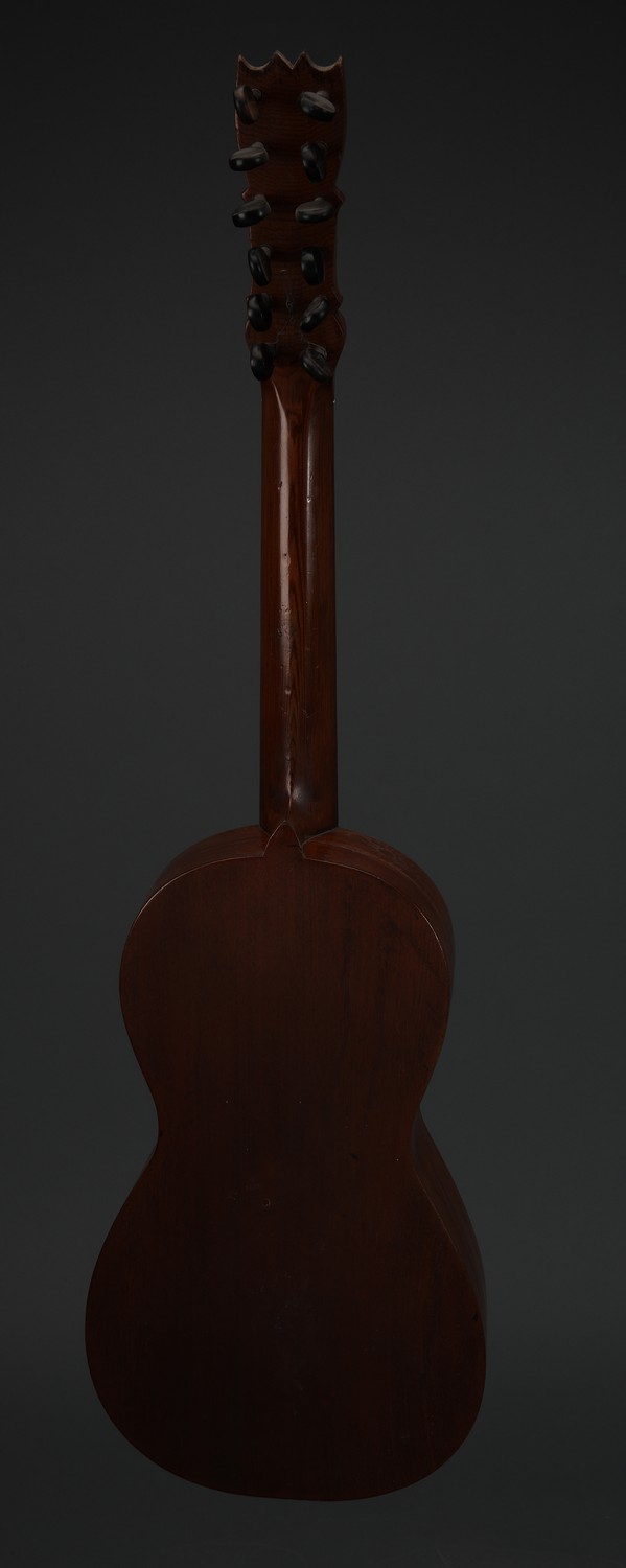 With two heart shaped sound holes, above a double bird ended bridge and a fleur-de-lis motif to lower body, paper label to interior