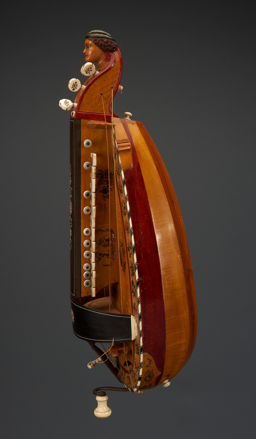The whole decorated in polychrome floral decoration with a carved female head emanating from peg head. With bone inlay. Stamped 'POUGET / ARDENTES / INDRE / 1876'. In original case Contains Brazilian Rosewood.