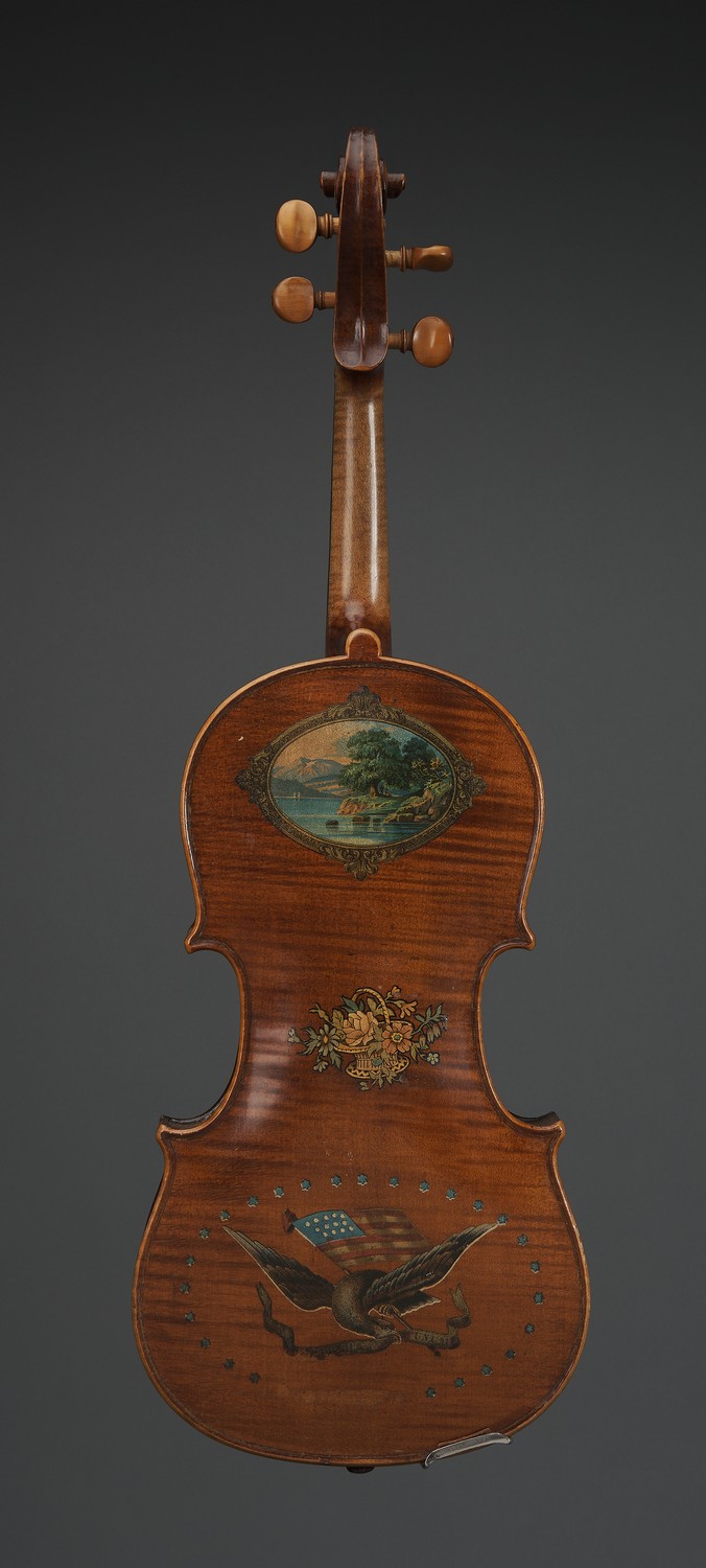 Floral mother-of-pearl inlay to neck. The verso decorated with transfer printed scene of an eagle in flight holding an American flag, beneath a lakeside scene and basket of flowers.