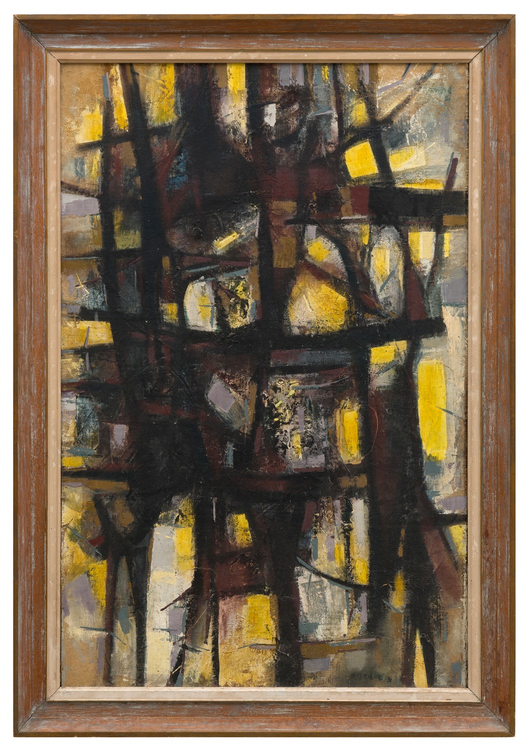 Work in overall good condition. Frame appears slightly too big in size for the work, exposing the side edges from the front. Due to highly textured nature of the work dust has settled on the areas where layered painted has created catchment areas. No holes, tears or warping is evident in work.