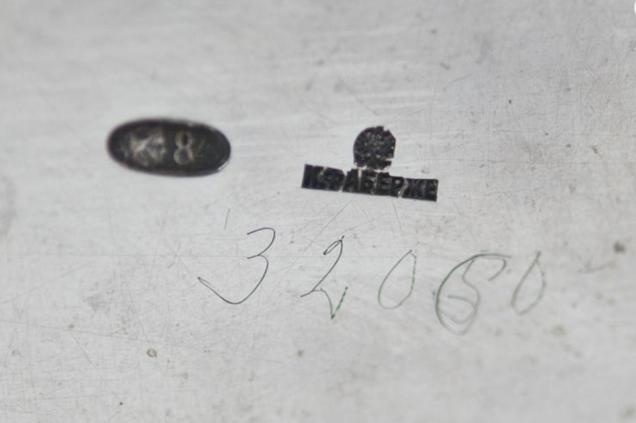 The shallow bowl with a gilt wash interior and palmette and patera border to rim. Hallmarked with the Fabergé mark and a Russian silver 84 Zolotnik mark.