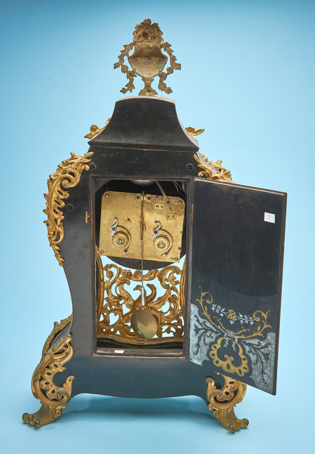 Having a verge escapement and silk suspension movement, with an ebonised case, inlaid in cut brass, surmounted with an urn finial, applied with ormolu throughout, the unique rippled and enameled clock face showing Roman and Arabic numerals, set within an ormolu panel featuring a double headed eagle, raised on four scrolled ormolu feet