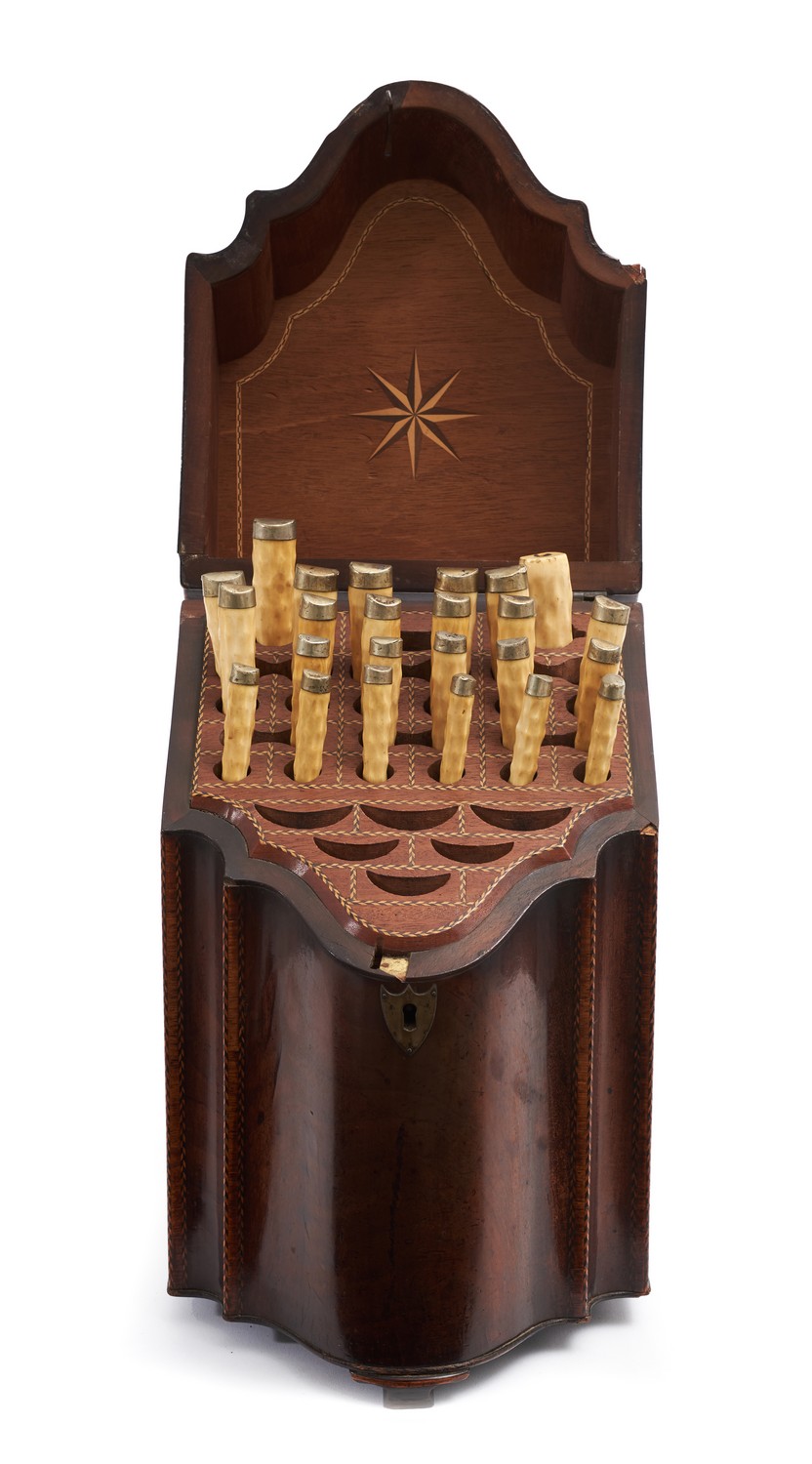 A GEORGIAN MARQUETRY INLAID CULTERY BOX & CONTENTS*