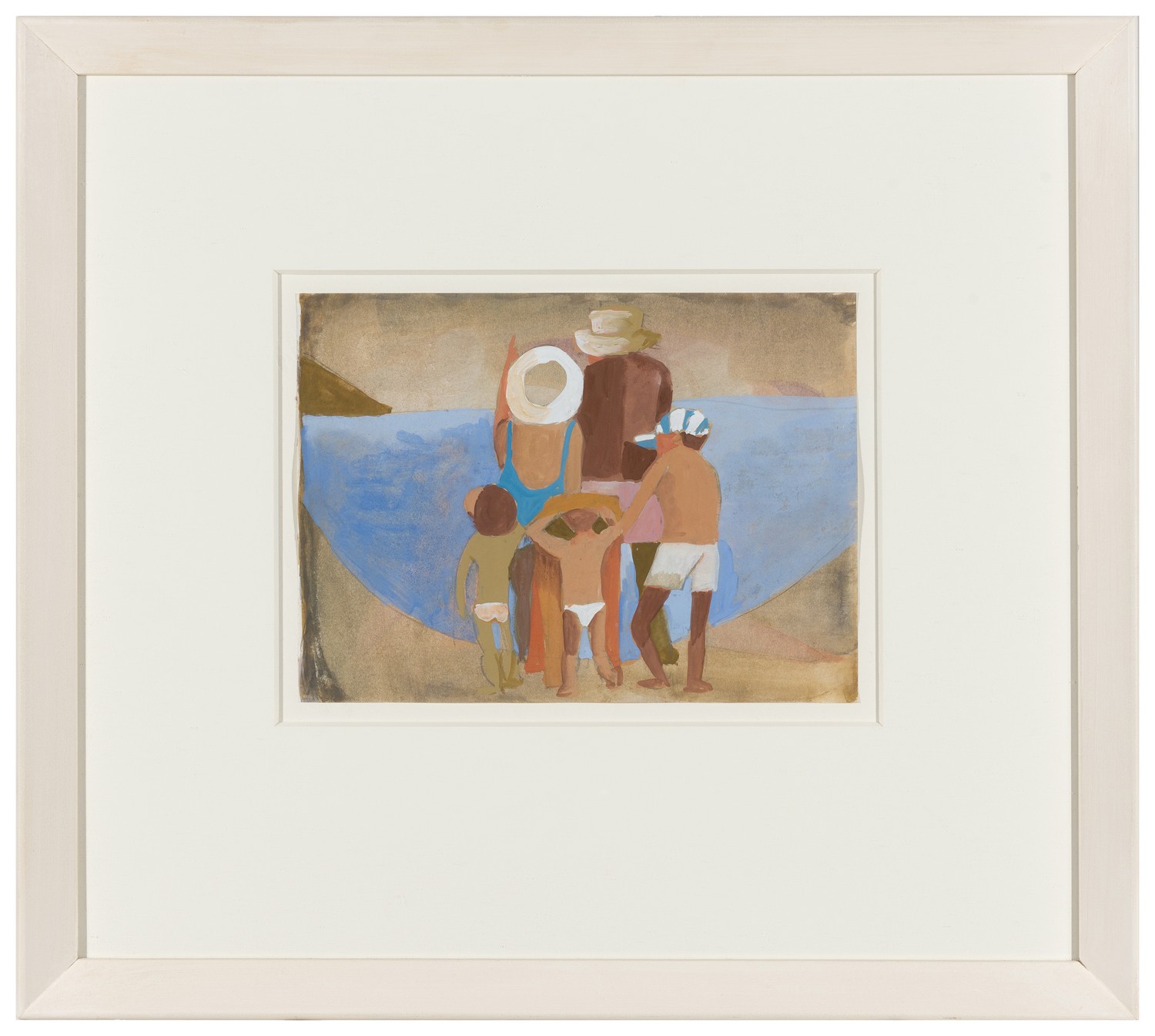 No foxing seen across paper however one pin-head sized dot on the work on paper in the upper mid left hand side. Evidence of old adheshive tape can be seen coming out from the back on the left hand side (no discolouration or staining evident from front). Paper very stable and colours are bold. Work is well framed.
