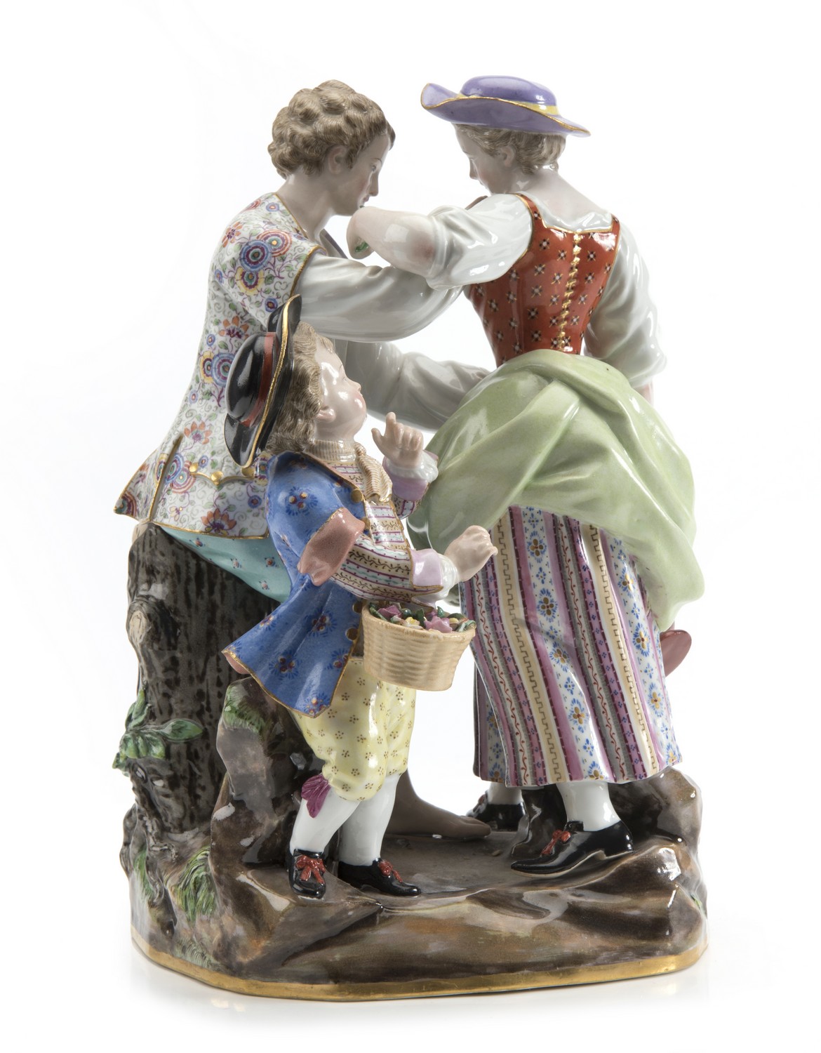 Modeled as a young woman being courted by a lover, in a naturalistic setting. Incised BM to base with blue underglazed crossed swords.