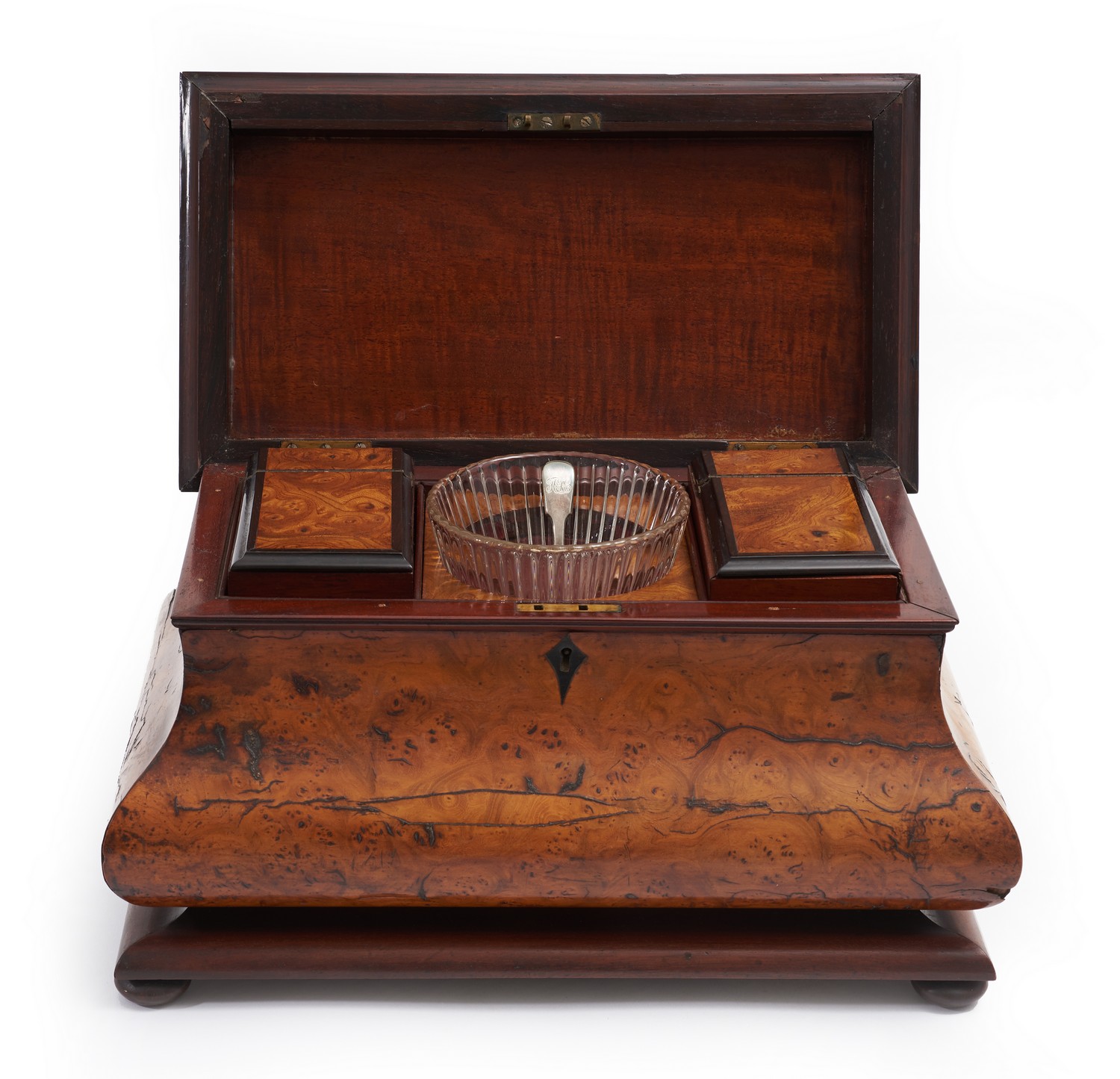 Of sarcophagus form with generous proportions, the lid opening to reveal two original tea canisters with a married glass bowl, accompanied by a silver-plate spoon