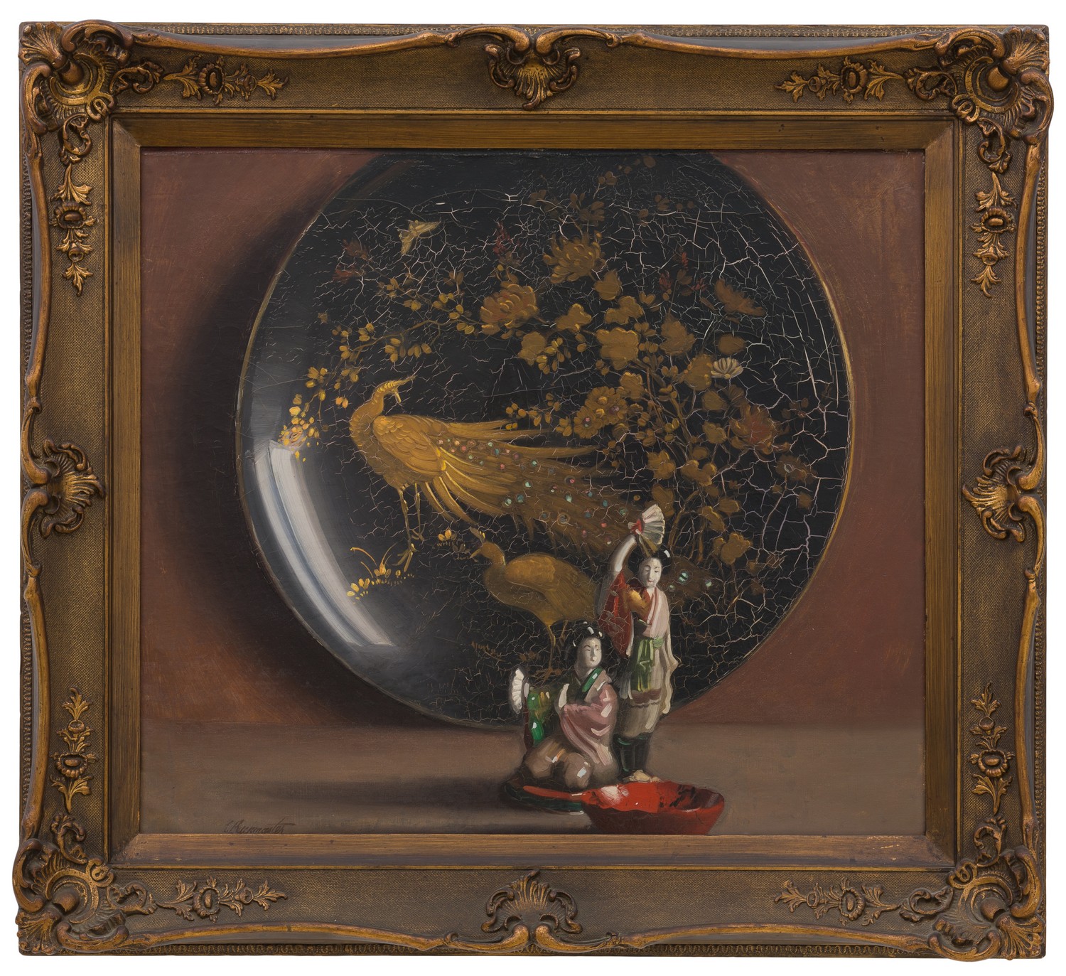 Significant splitting in the black paint (center area). Cracking is also present throughout. Paint loss in upper right center (pin-head sized). No apparent restoration work done to canvas. Possibly housed in the original frame, in very good condition.