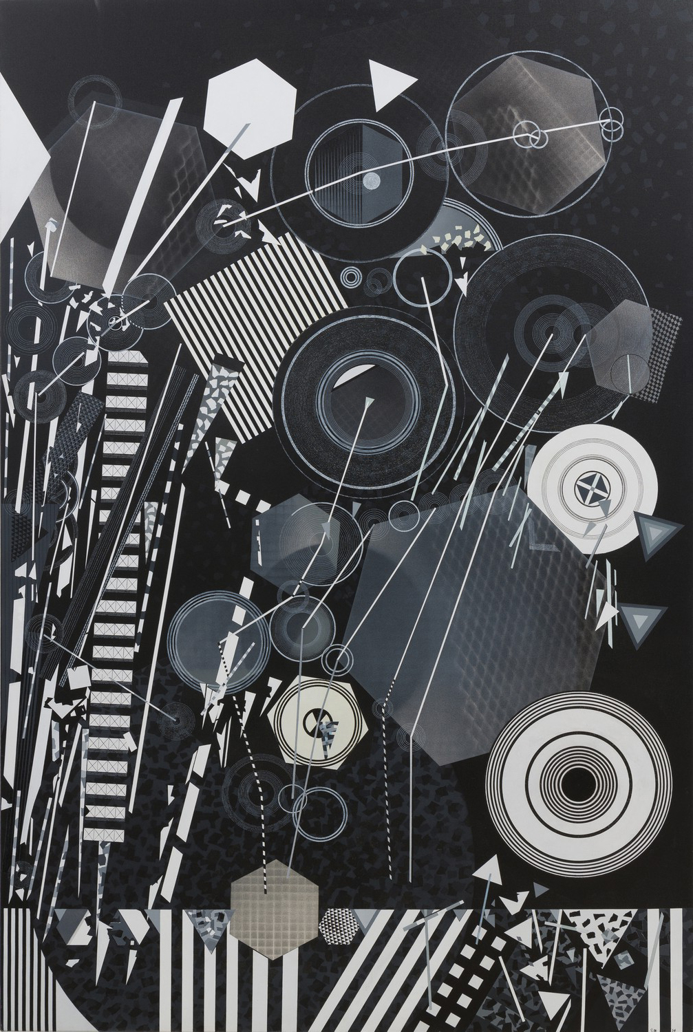 Work is in near perfect condition. Very, very minor issues to report: Losses seen in the black pigment, upper right and left hand corners (tiny white dots where the black paint has rubbed against something). Very light small scuffing in the outer edge corners of all works. No tears or problems with any of the canvases.