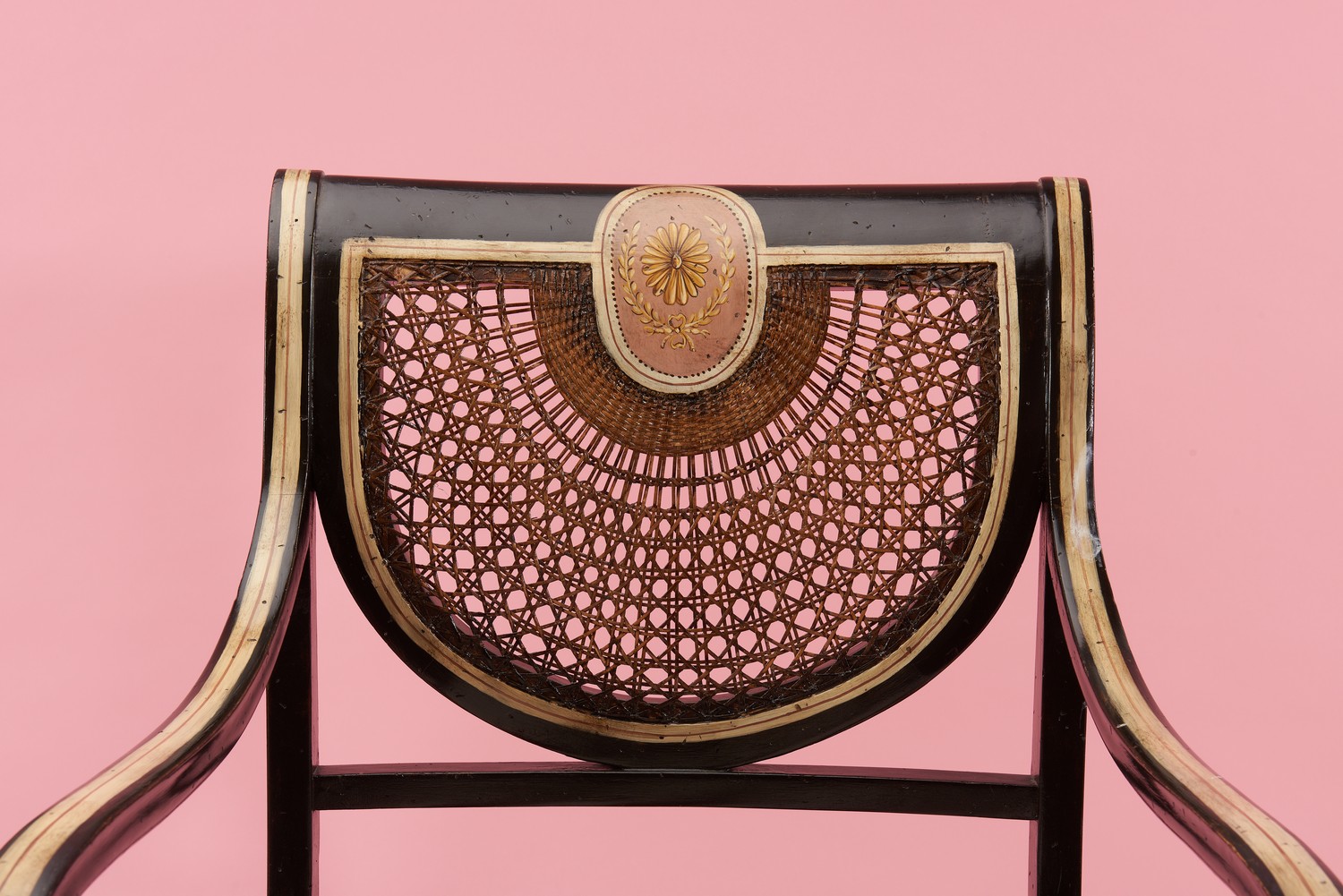 Each chair painted in black and cream with cartouches to the centre of the back rails above decorative rattan panels, the outswept scrolled arms above seats upholstered in faux Zebra hide, raised on turned front legs with bands of gold
