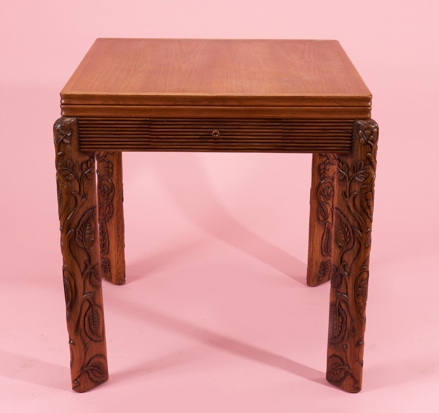 The fold-over top comprising two hinged leaves, above reeded panels and a single drawer, the whole raised on four relief carved legs with vine motifs