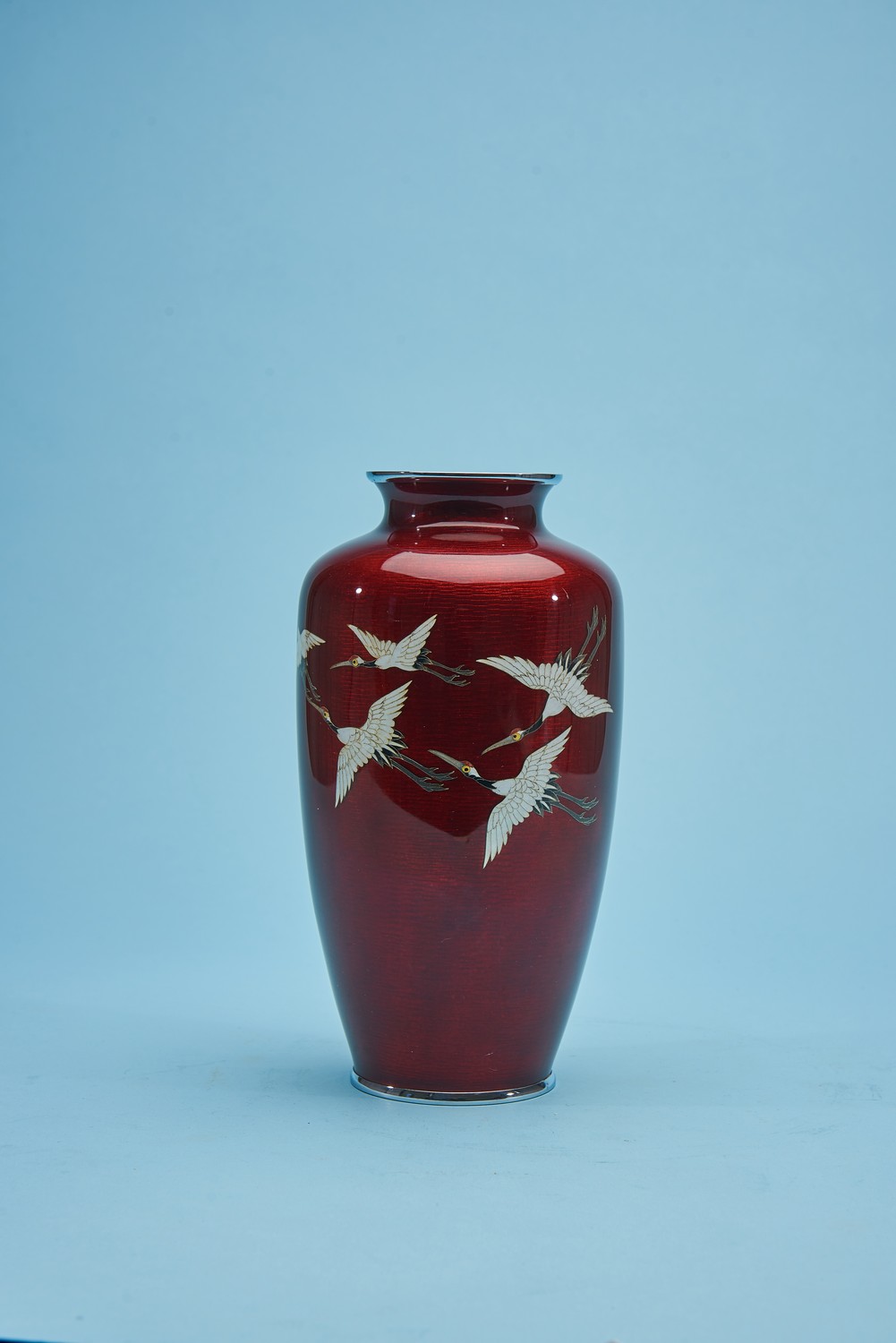 The tapering vase depicting five cranes on a blood red enamelled ground. Sato mark to base.
