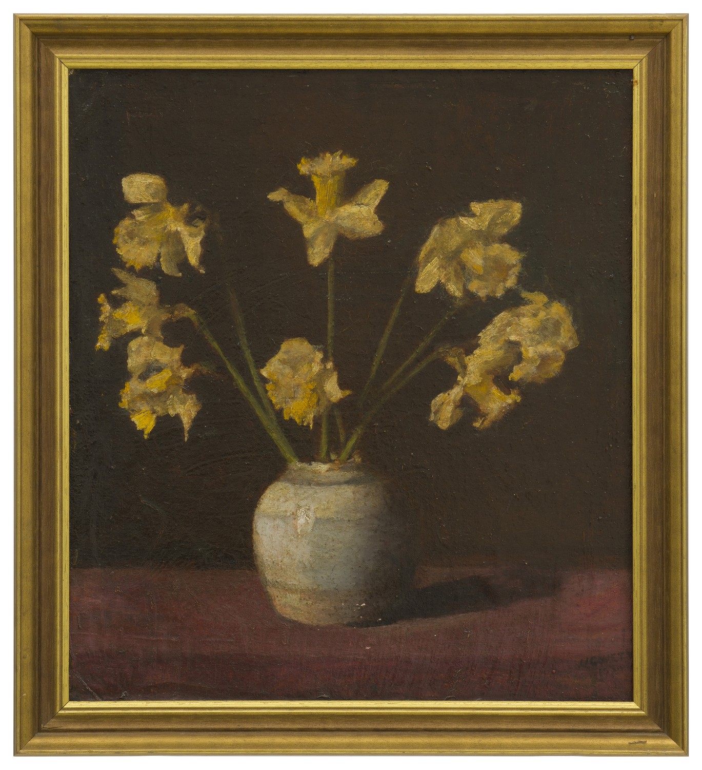 Some uneveness in the canvas and board resulting in the bubbling affect on the surface. Seen mainly in the upper left hand side running down vertically. Small losses seen in the lower center area (on vase) and evidence of previous repair on painting in the center region (two faint horizontal lines).