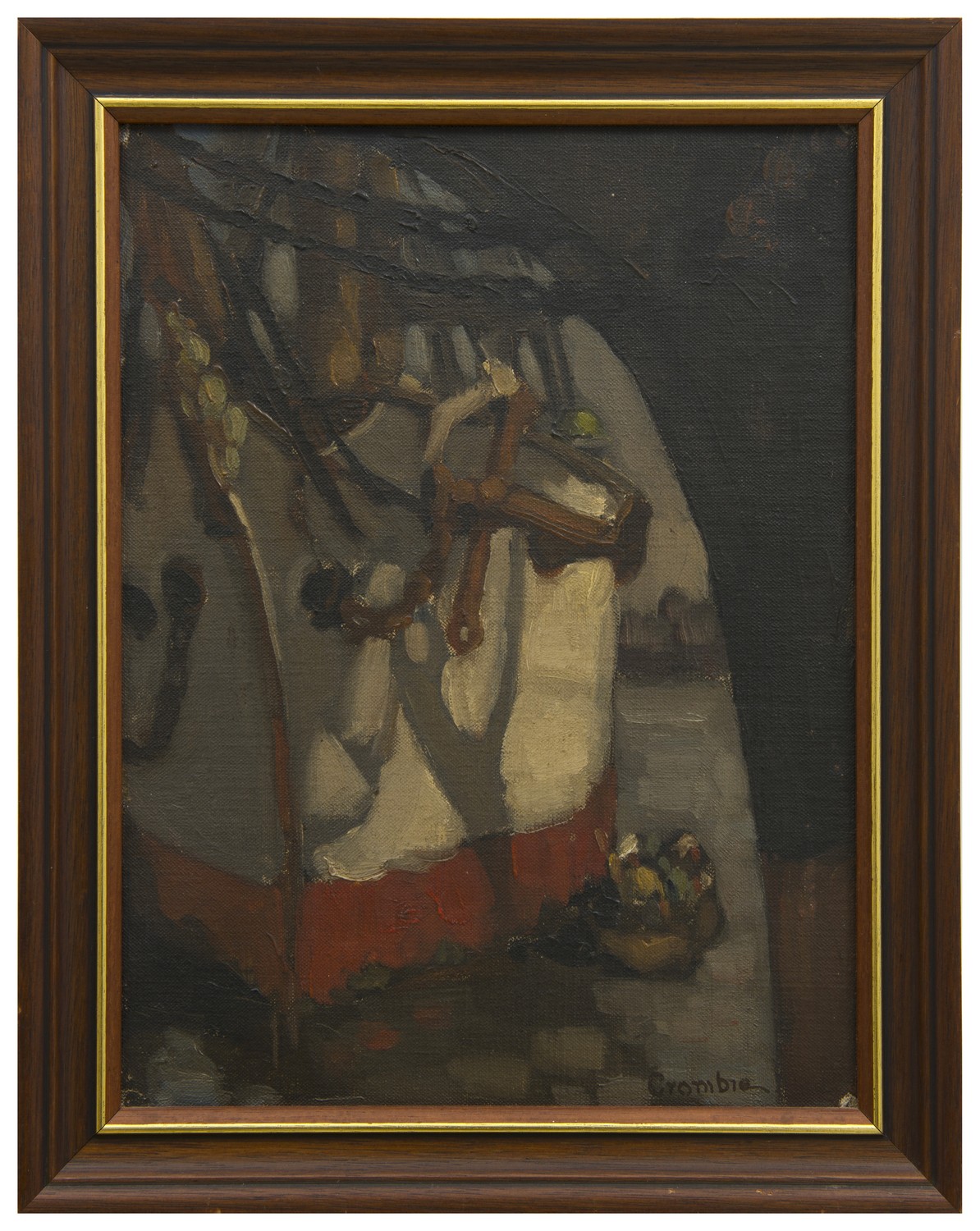 Fair condition overall consistent with age. Some fly spots and minor losses. Minor pin sized holes in far corners, likely fro previous framing. Therefore areas of exposed white canvas in far corners are likely inherent and were previously concealed.