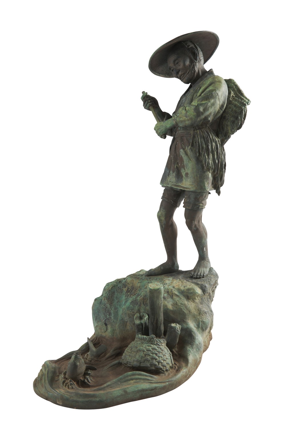 A JAPANESE PATINATED BRONZE FIGURE OF A FISHERMAN