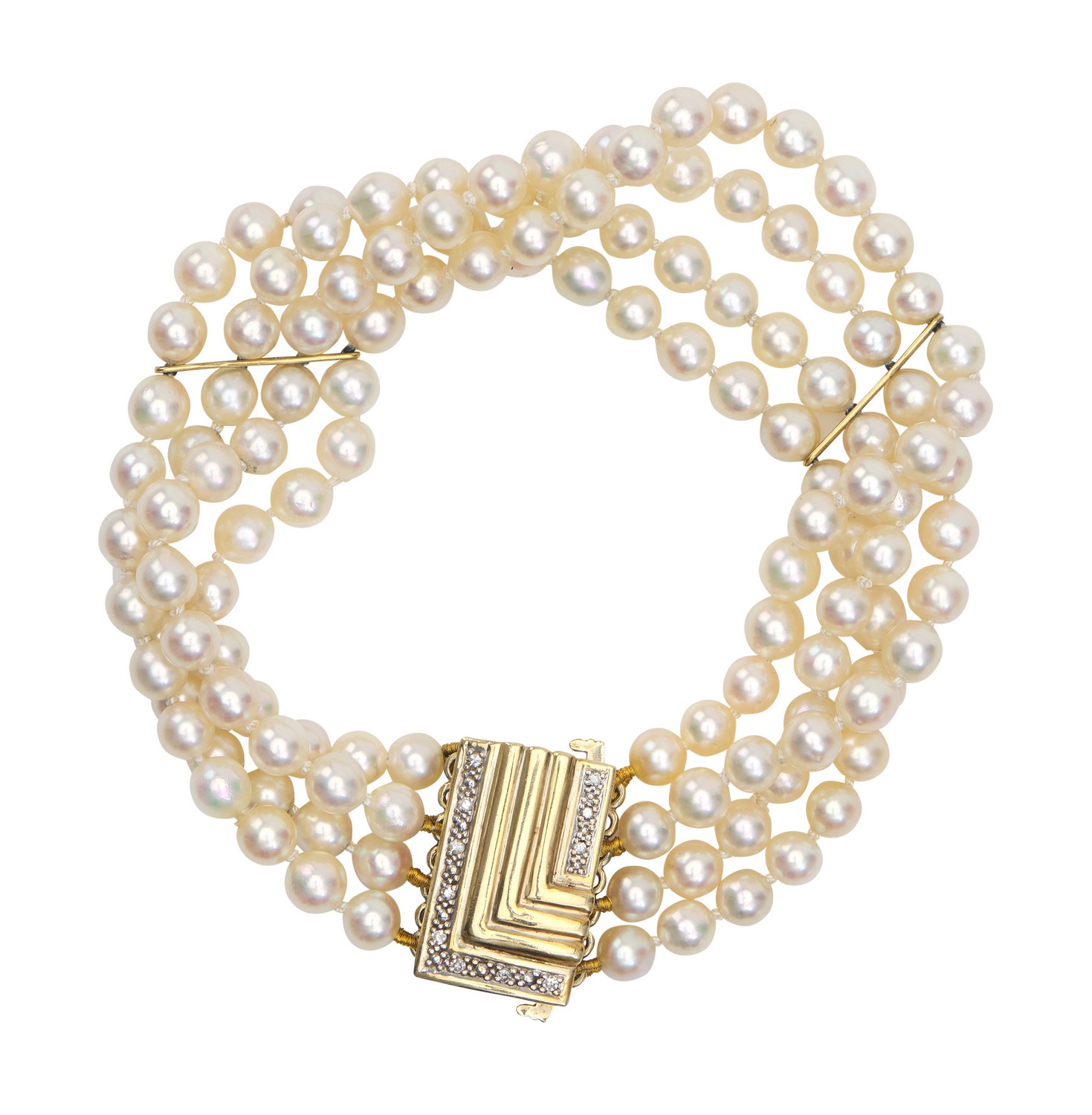 Comprising four rows of cultured pearls of cream and pink hues, measuring 4.5mm to 5.0mm, to a rectangular clasp with fine diamond detail, in 9ct gold, total length 185mm.