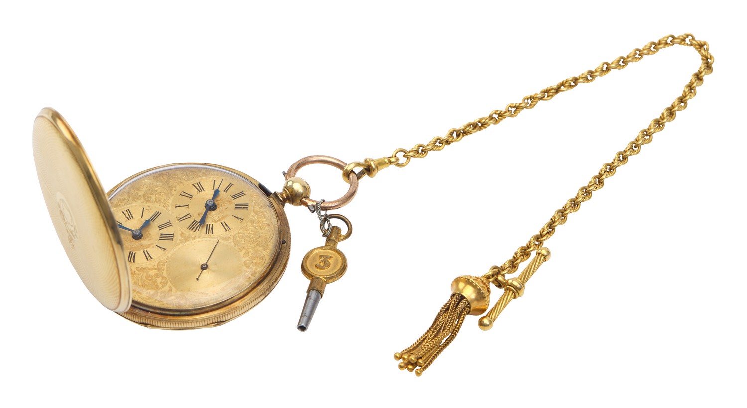 Key wind, key set, circular gold dial with dual time zones with black Roman numerals, subsidiary seconds dial at six, signed case dial and movement, Moulinie Geneve, 18ct gold engine turned case, together with an Albertina in 18ct gold, circa 1860.