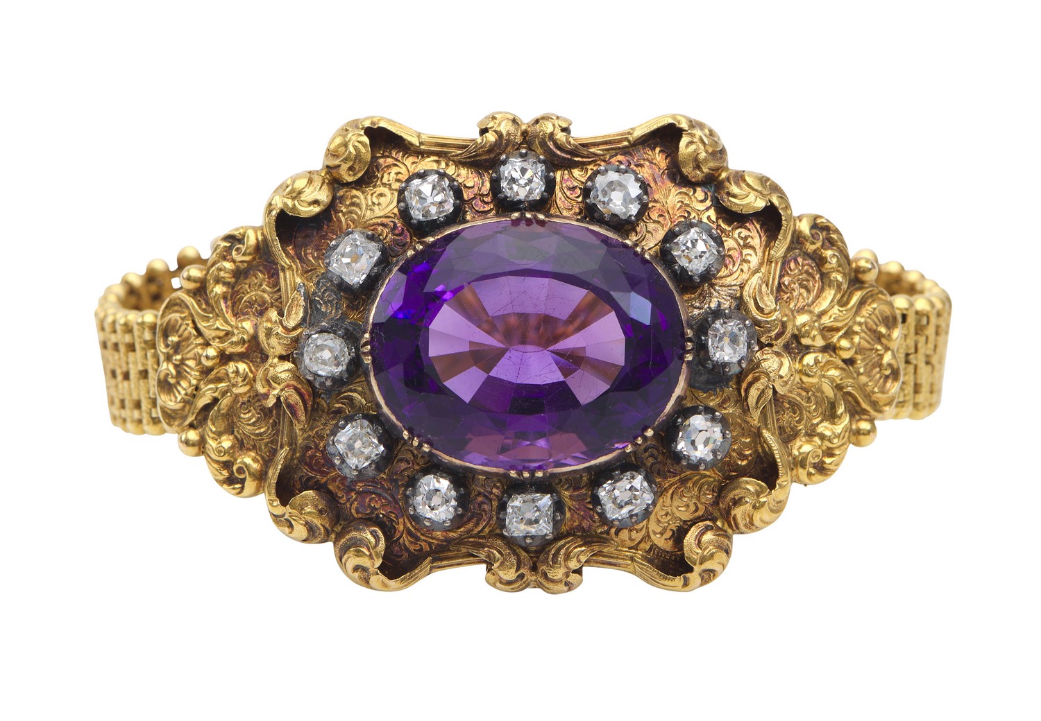 Comprising an oval amethyst within a surround of twelve old European cut diamonds,centred on an ornate repousse work plaque and mesh bracelet bands, in 15ct gold, in original fitted box by Rowlands & Frazer of London, circa 1860.