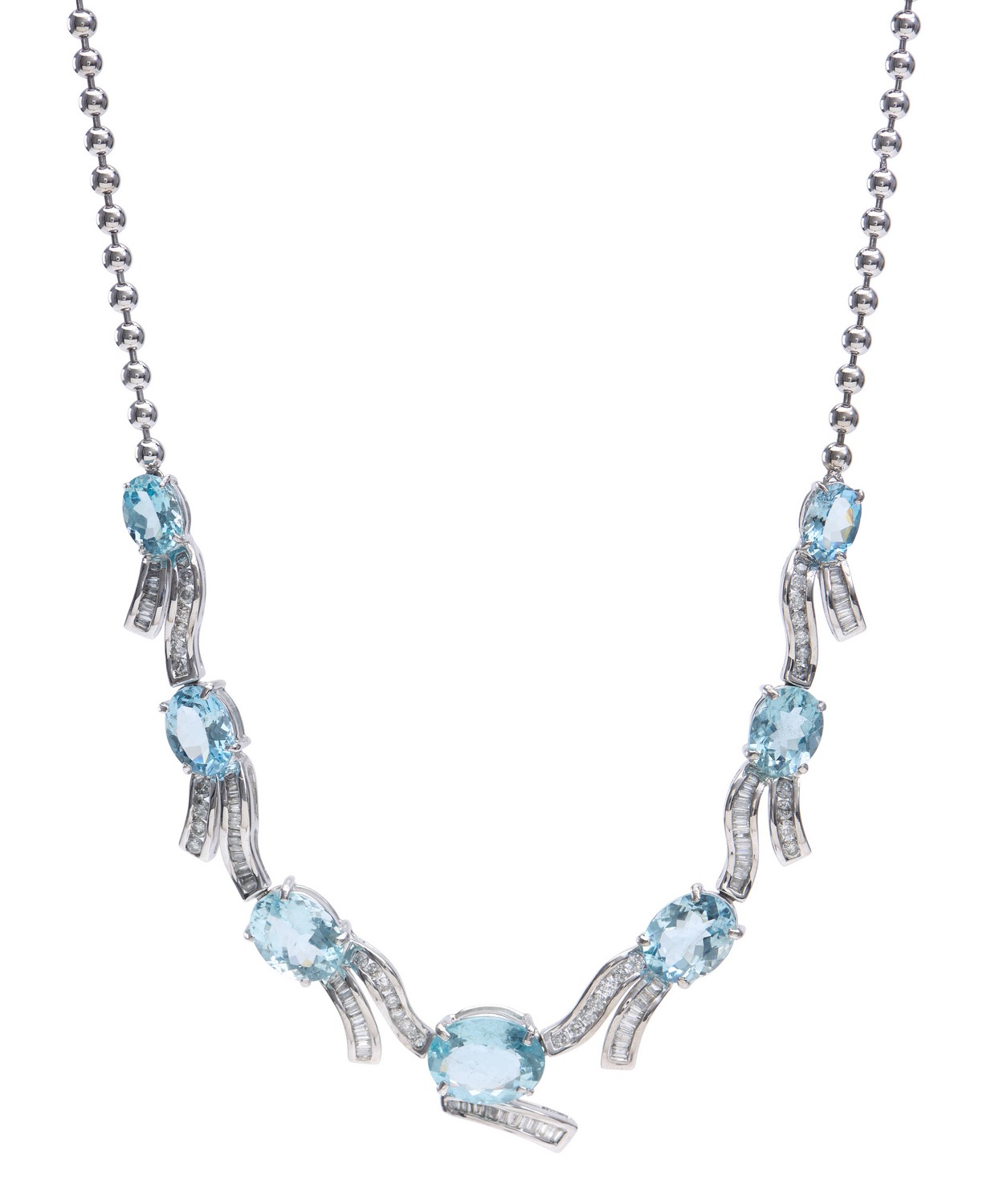 The necklace comprising claw set oval aquamarines with baguette and round brilliant cut diamond set ribbon highlights, together with a pair of earrings of conforming design, total aquamarine weight 5.80cts, total diamond weight 2.40cts, in 18ct white gold, total length 430mm.