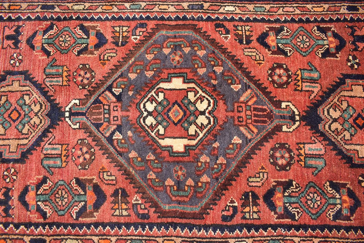 A FINE PERSIAN ENJELAS HALL RUNNER, 100% WOOL IN EXCELLENT CONDITION, FINELY HAND KNOTTED VILLAGE WEAVE FROM THE HAMADAN REGION WITH TRIBAL DESIGN OF TRIPLE ANCHORED MEDALLIONS IN A FIELD OF FLORAL PATTERNS AND LEAF FORMS, SIZE 308 X 105 CM, ORIGIN IRAN, RRP $1,900